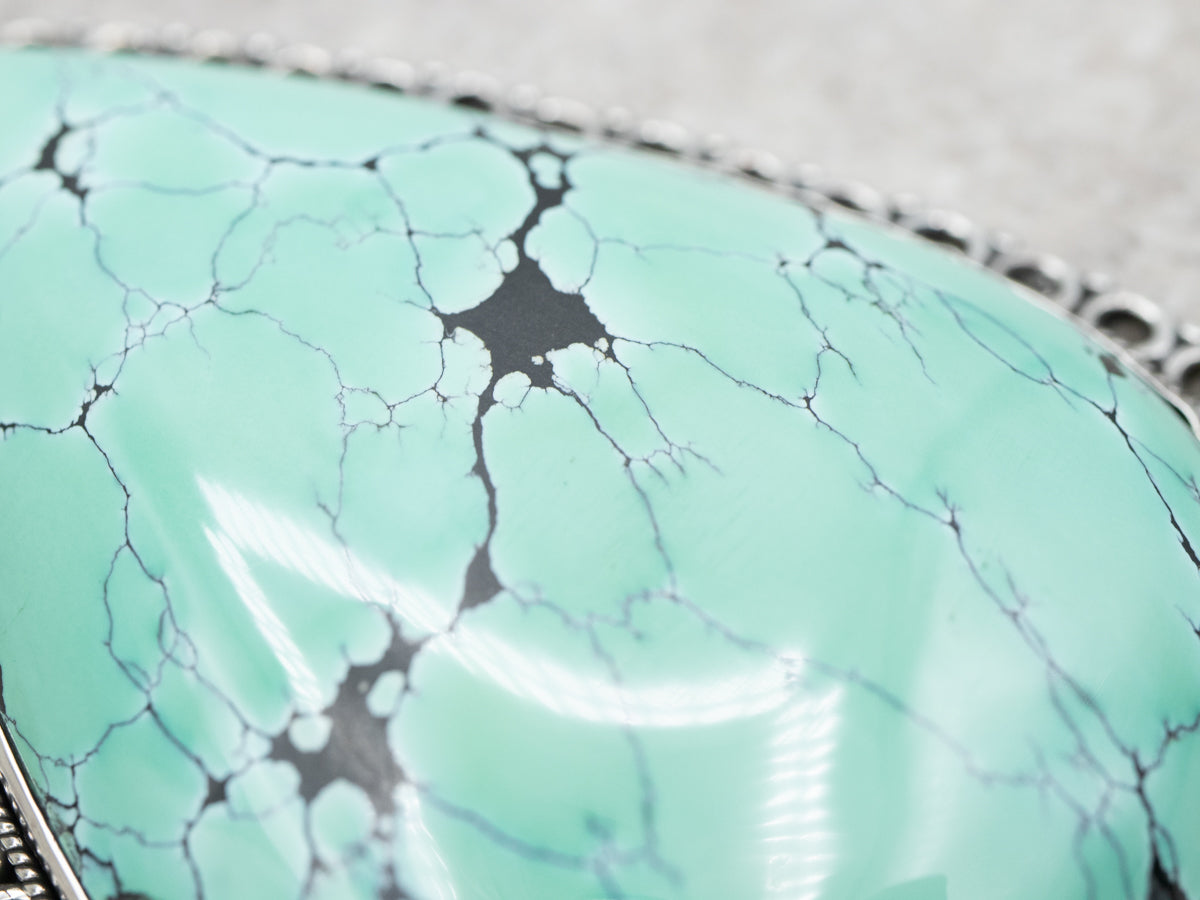 Brilliant blues, teal, black, and seafoam green shades shine from the center of this high-quality turquoise gemstone pendant. The sleek bezel edge with a slight patina is a perfect complement for this exquisite piece!
