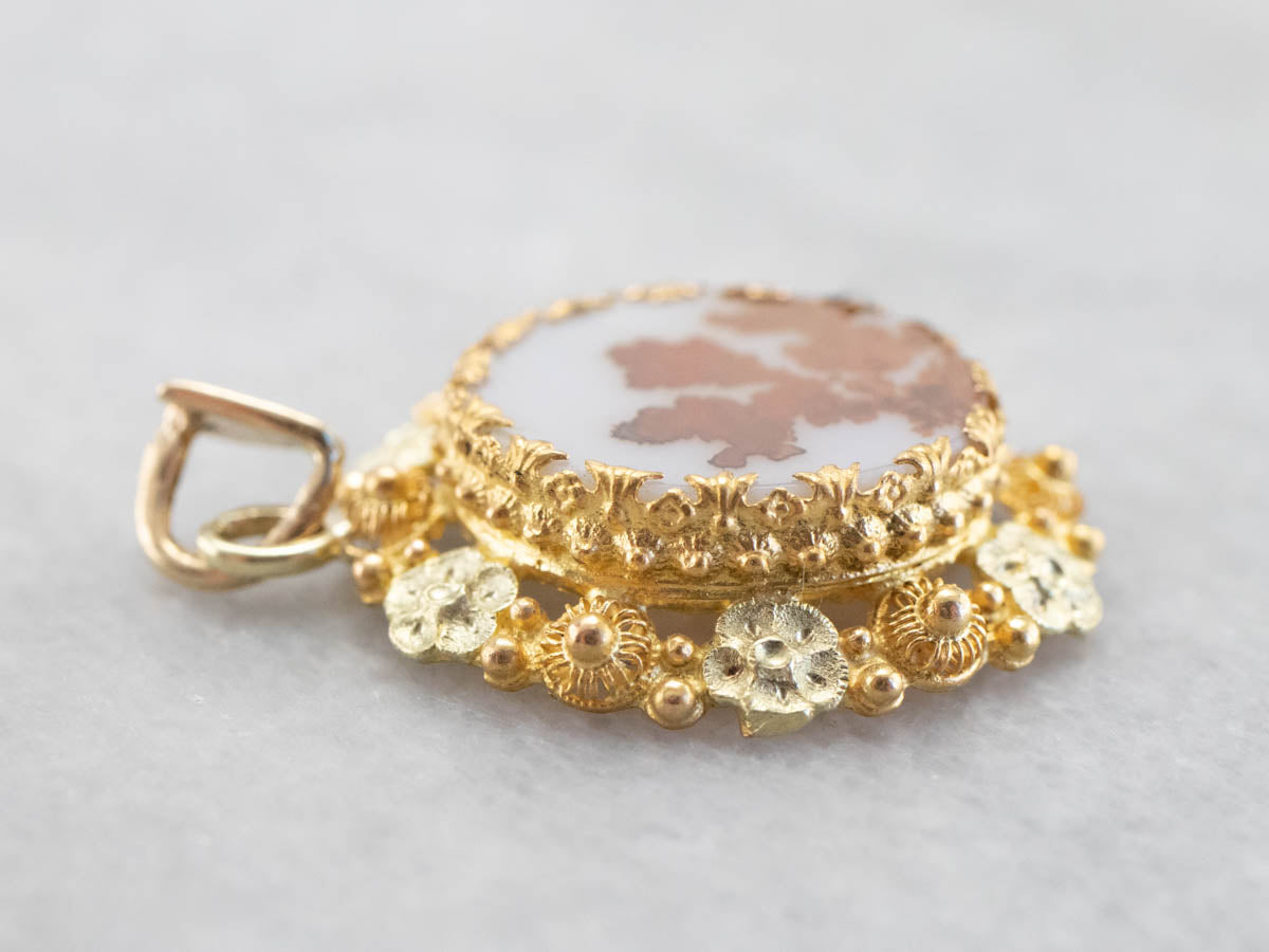 ¡Hemos colocado una hermosa pieza de piedra Shazar, también conocida como ágata dendrítica, en este dulce colgante! El marco floral dorado de dos tonos recoge el árbol como penachos de ágata, que destacan sorprendentemente en tonos oxidados sobre un fondo blanco lechoso.