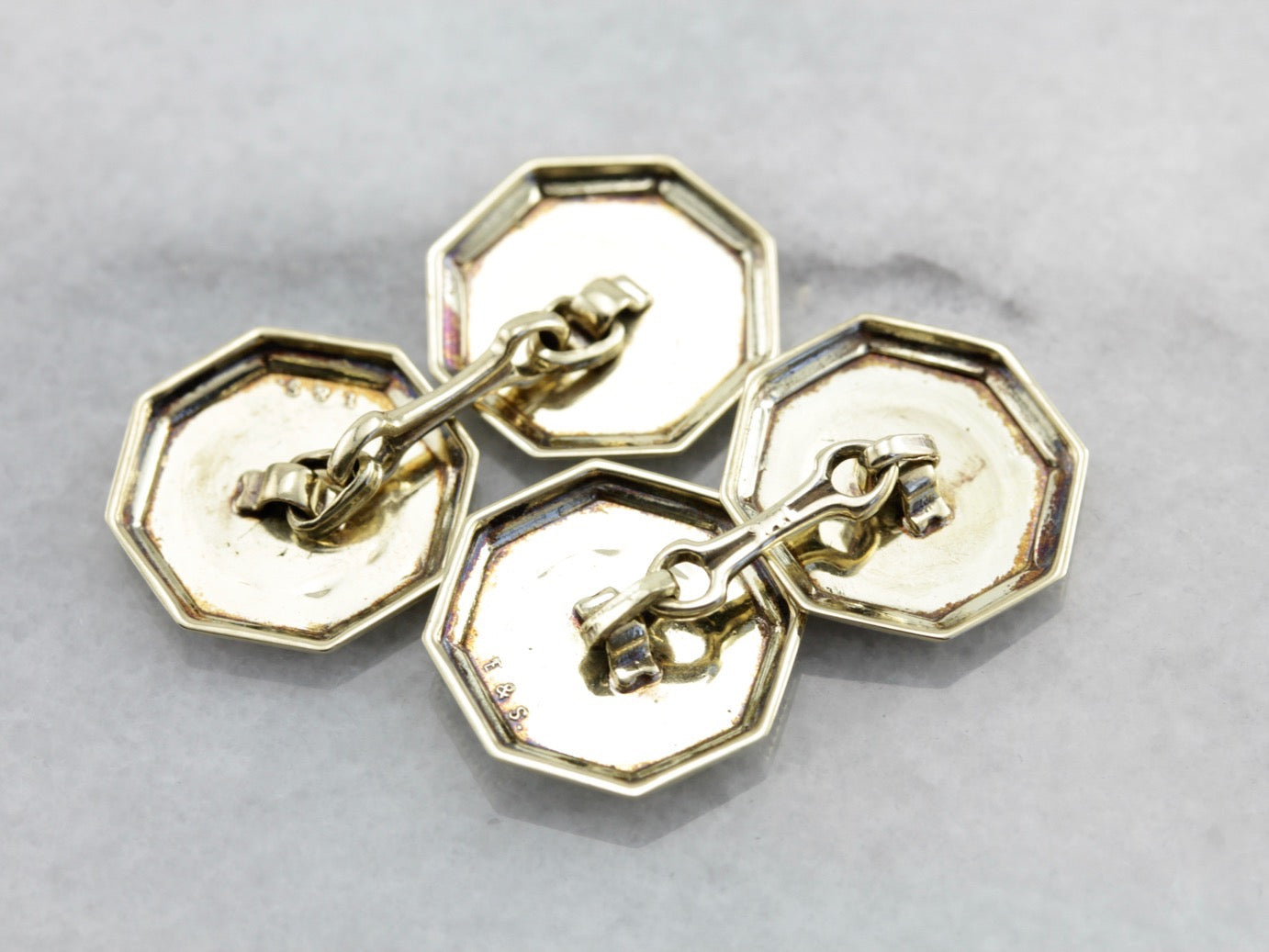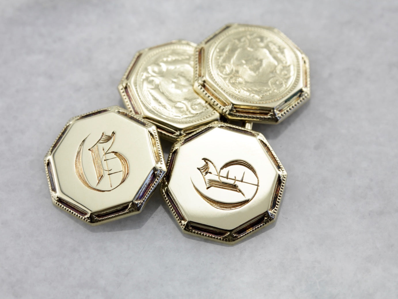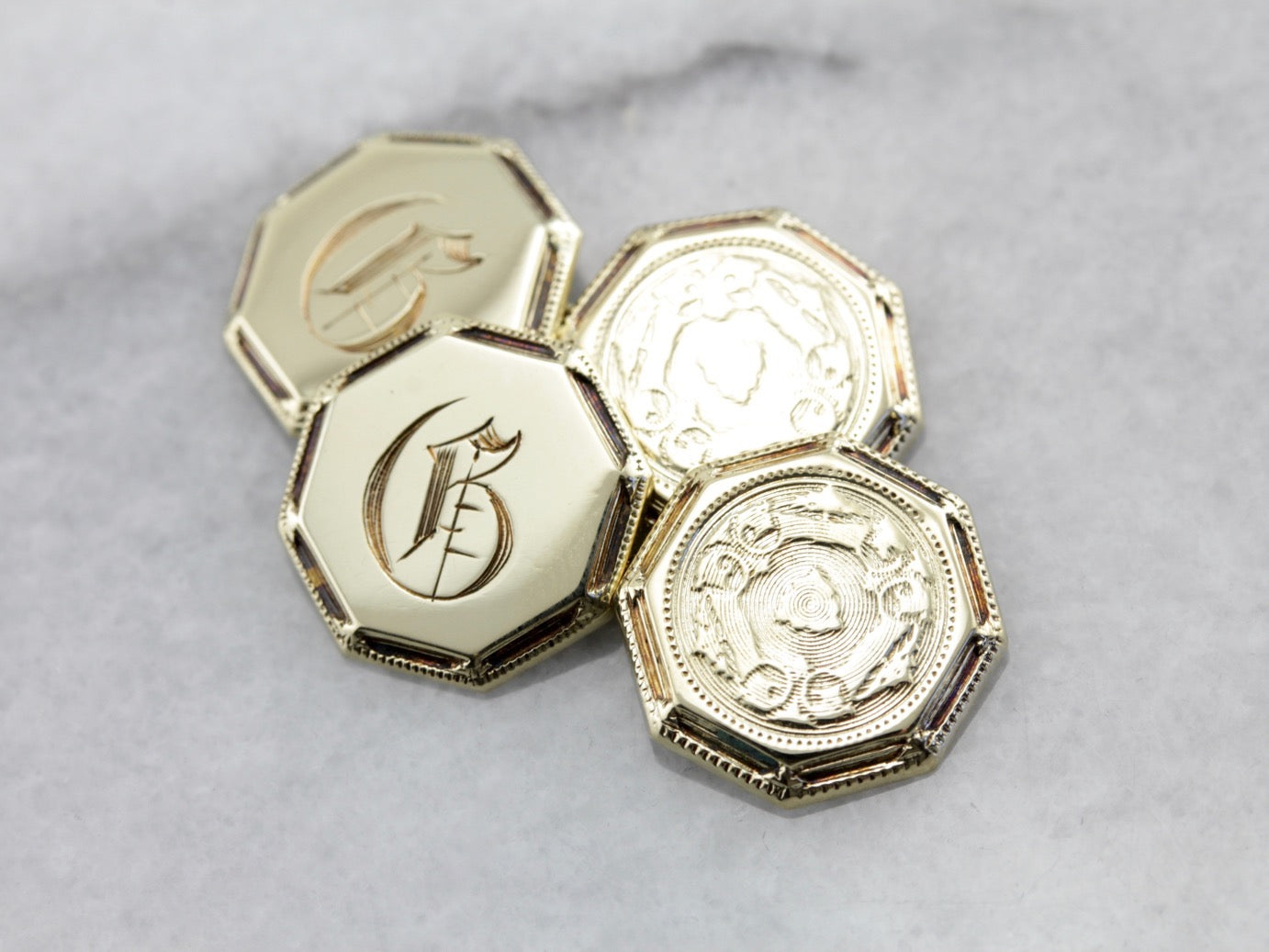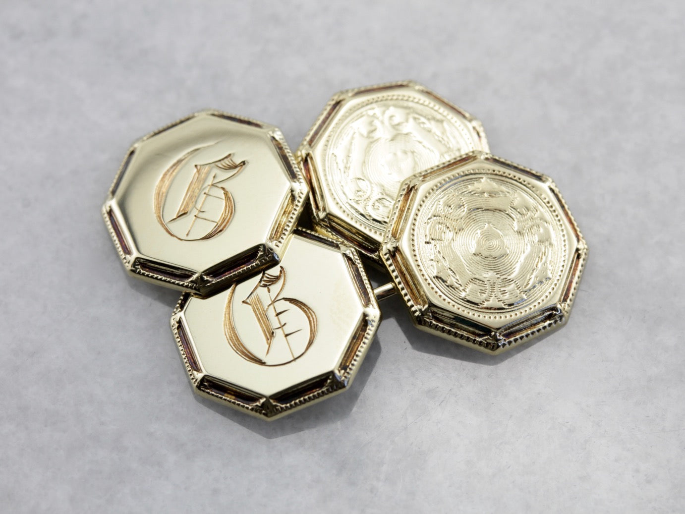 Con una textura sutil, estos gemelos presentan un motivo de escudo en los paneles decorativos, lo que les da un estilo sutilmente oficial. Hemos dejado los monogramas "G" originales en el frente, ya que el grabado de estas letras es preciso y artístico. Históricos y aún a la moda, estos gemelos vintage serían el mejor regalo de bodas.