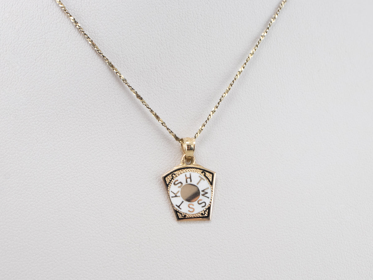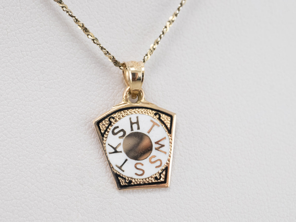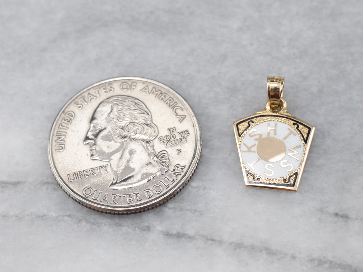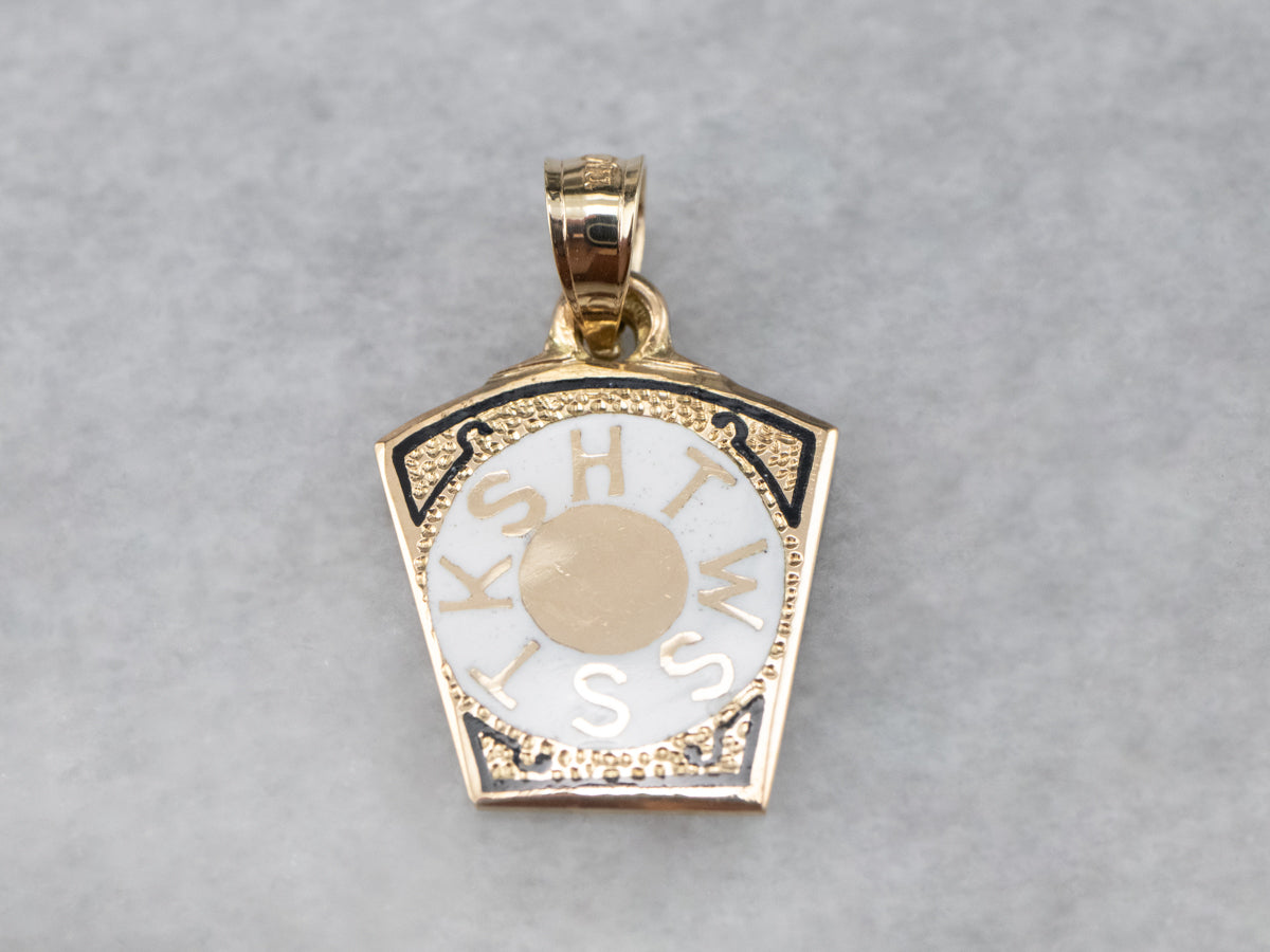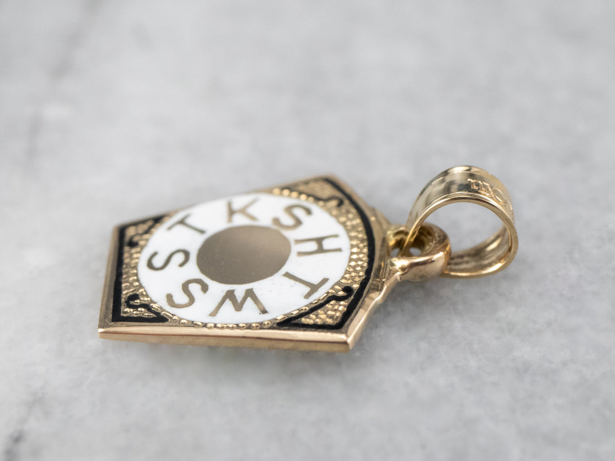 ¡Este encantador pedazo de historia de la fraternidad masónica! Las letras nítidas "HTWWTKS" en el esmalte indican que se lo regaló a un masón del Real Arco. Elaborada en oro de 14k, esta pieza se puede usar como colgante o como dije en la cadena de un reloj de bolsillo tradicional.