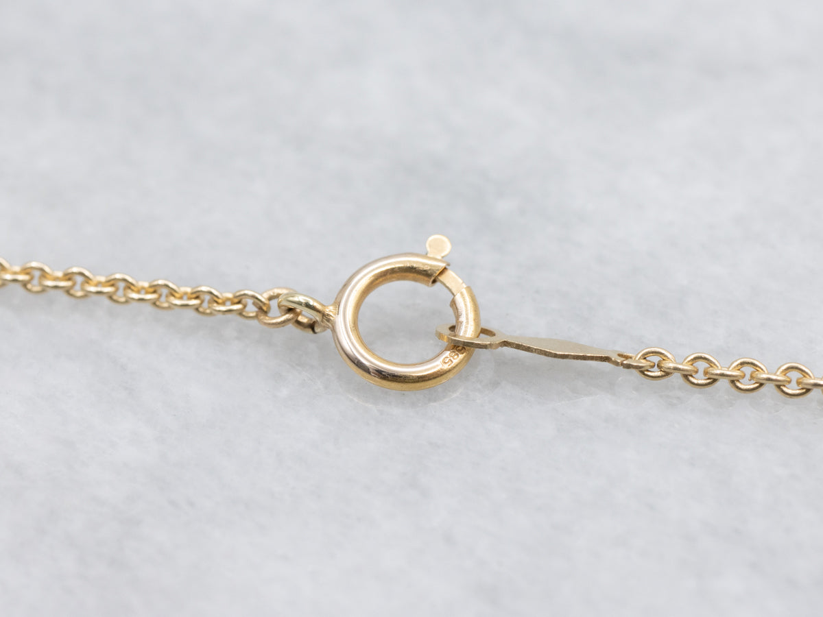 This diamond yellow gold necklace features exceptional craftsmanship. Three shining gold tags adorned with sparkling diamonds hang gracefully from a polished rolo-link chain. This beautiful vintage piece effortlessly moves from professional settings to evening outings.