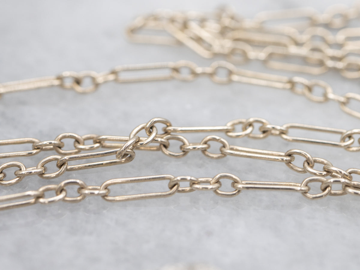 This impressive pendant features intricate filigree, classic to the Art Deco era. Floral details add femininity, with sparkling diamonds catching light with every movement. Sweet seed pearls make for lovely accents, and the trombone links elongate the necklace.