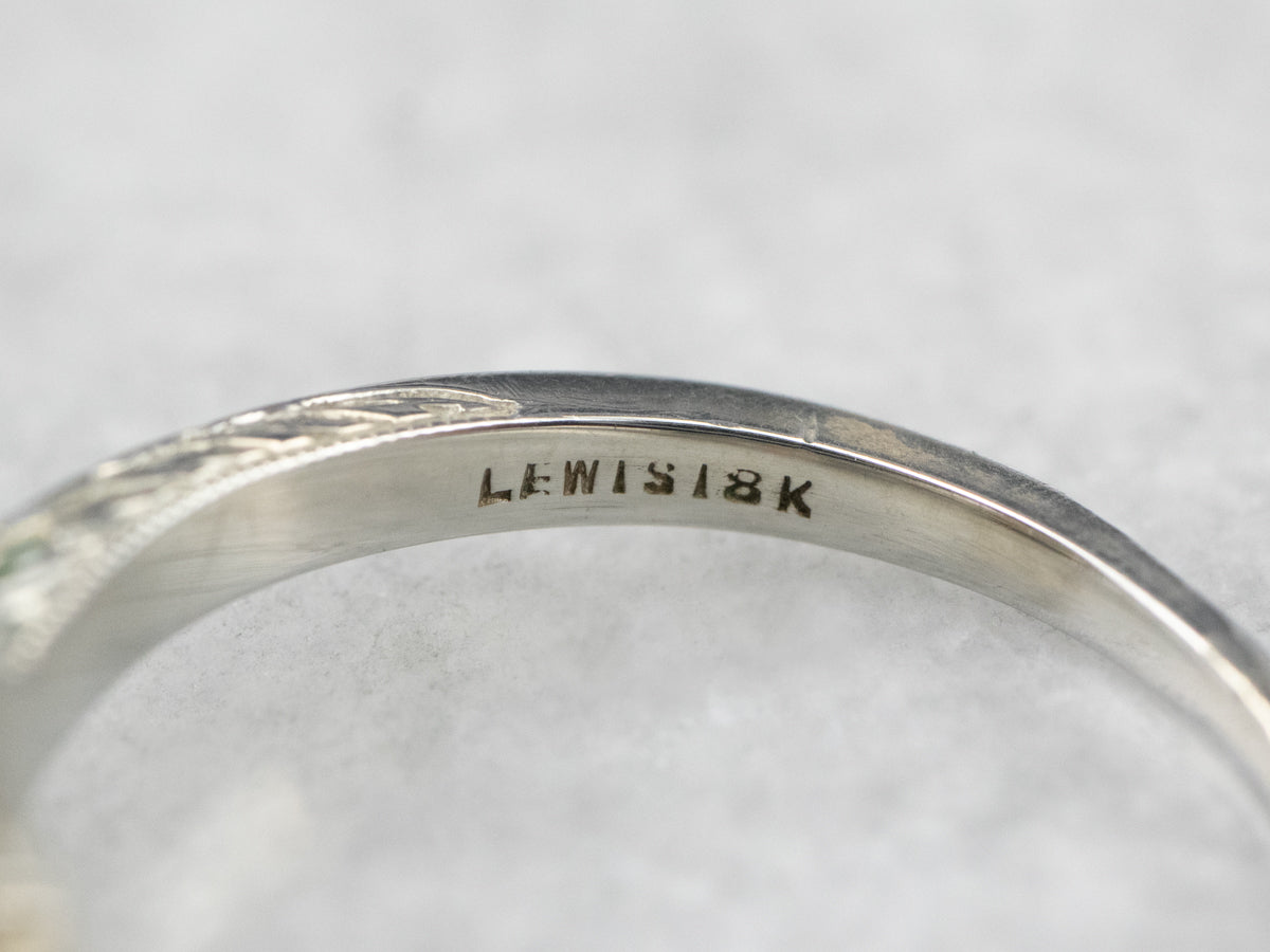This Art Deco pearl ring is classic, yet full of wonderful detail! Structured and architectural in style, the ring has geometric patterning all along the shoulders and in the profile of the ring, crafted in 18 karat white gold. A single shimmering pearl makes a lovely centerpiece!