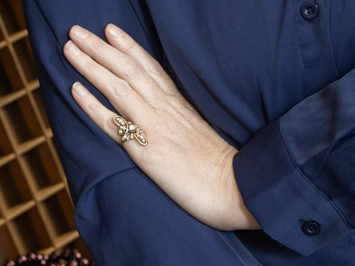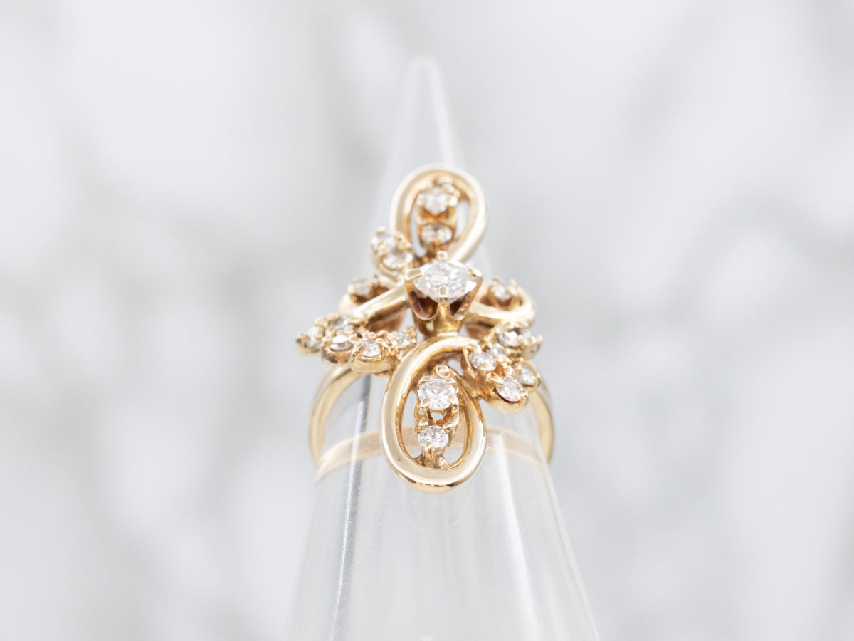 This striking navette ring is crafted from polished 14-karat gold, featuring a dazzling diamond cluster. The elegant combination of the looping gold and diamonds makes for an eye-catching design that will turn heads.