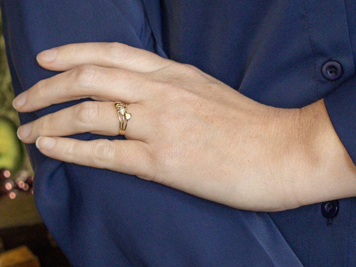 A timeless expression of devotion, this sweetheart band features three delicate hearts adorned with diamonds, capturing the romance of vintage design. Each heart is meticulously crafted to showcase brilliant sparkle while maintaining the graceful proportions characteristic of classic jewelry. Perfect for engagements, anniversaries, or as a meaningful gift, this piece combines sentimental symbolism with enduring elegance. The vintage aesthetic ensures it complements both contemporary and traditional styles, making it a versatile addition to any fine jewelry collection.