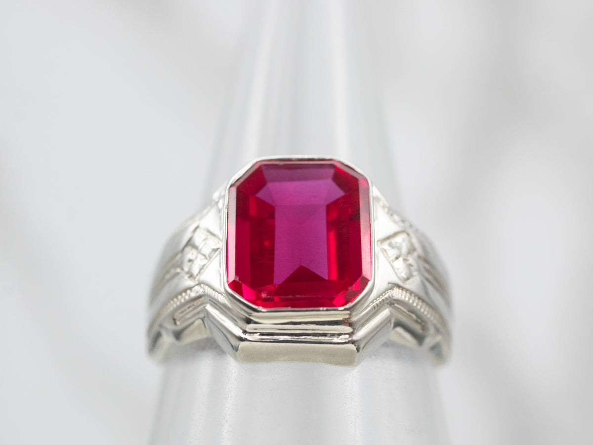 Metal: oro blanco de 10 quilates. Gema: Rubí sintético Medidas de la gema: 7,8 x 9,8 mm, talla esmeralda Tamaño del anillo: 6.50 Marcas: "10K" estampado en la banda interior