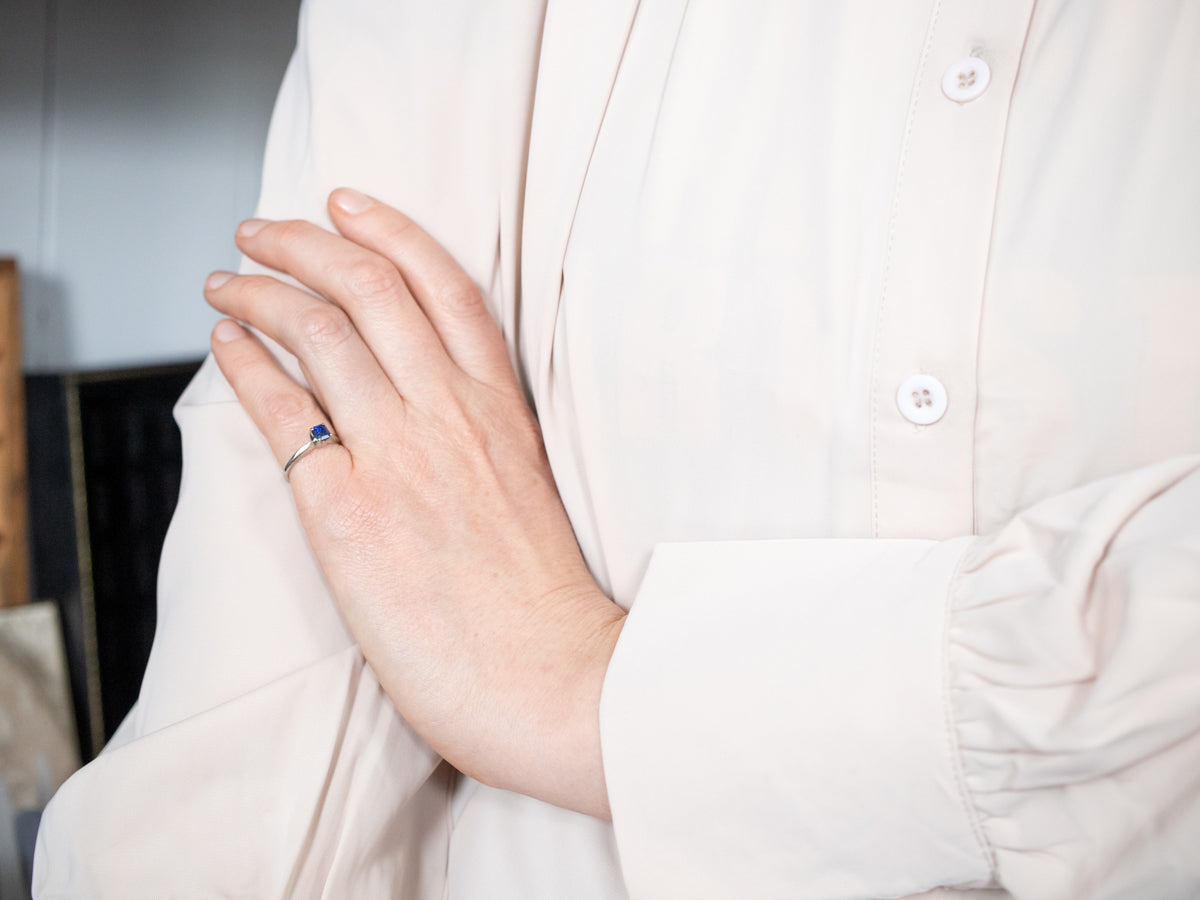 This is a well-proportioned ring, classic and sophisticated. The brightly polished sides have a great heft to them, and this is comfortable on the finger, with a rich feel. We've set the center with a bright blue sapphire that has glittering cerulean highlights and plenty of sparkles.