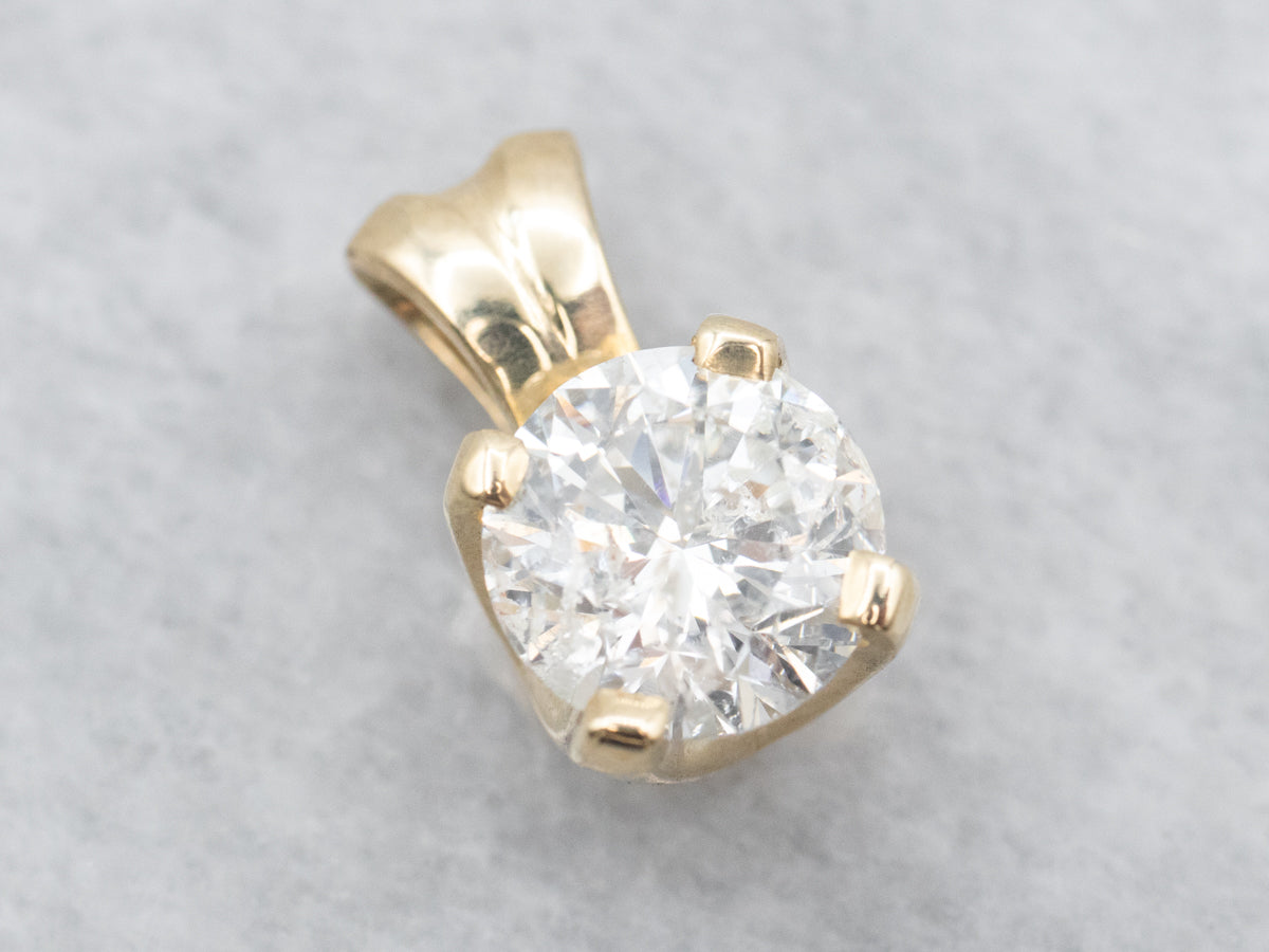 Metal: 14K Yellow Gold Gem: Diamond 1.22 Carats, I2 in Clarity, J in Color Gem Measurements: 6.7 mm, Round Measurements: 7 x 12 mm, with bail