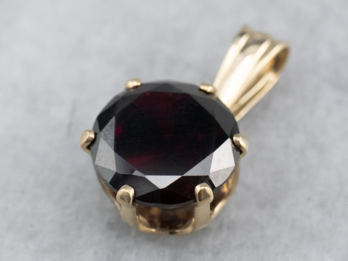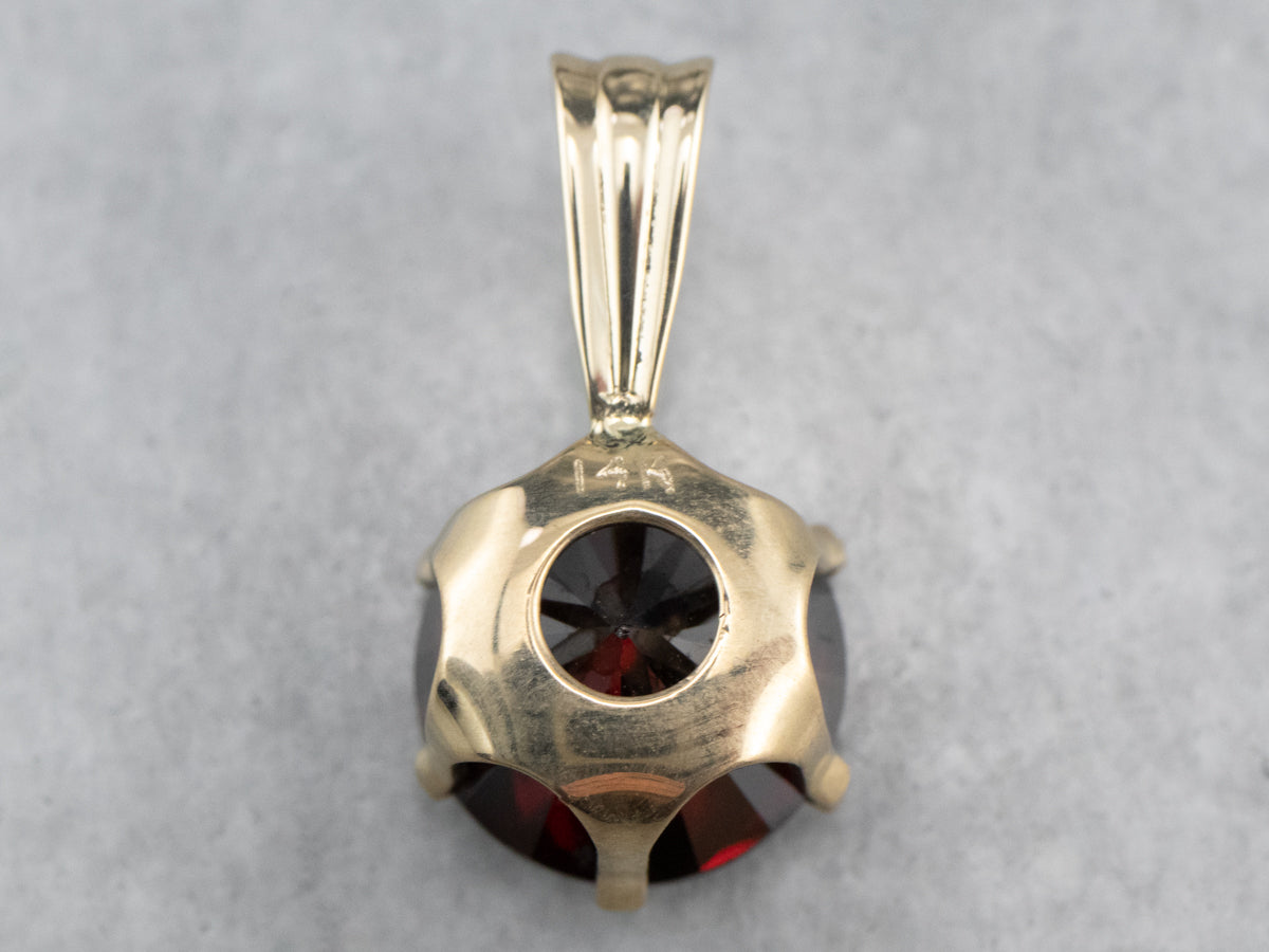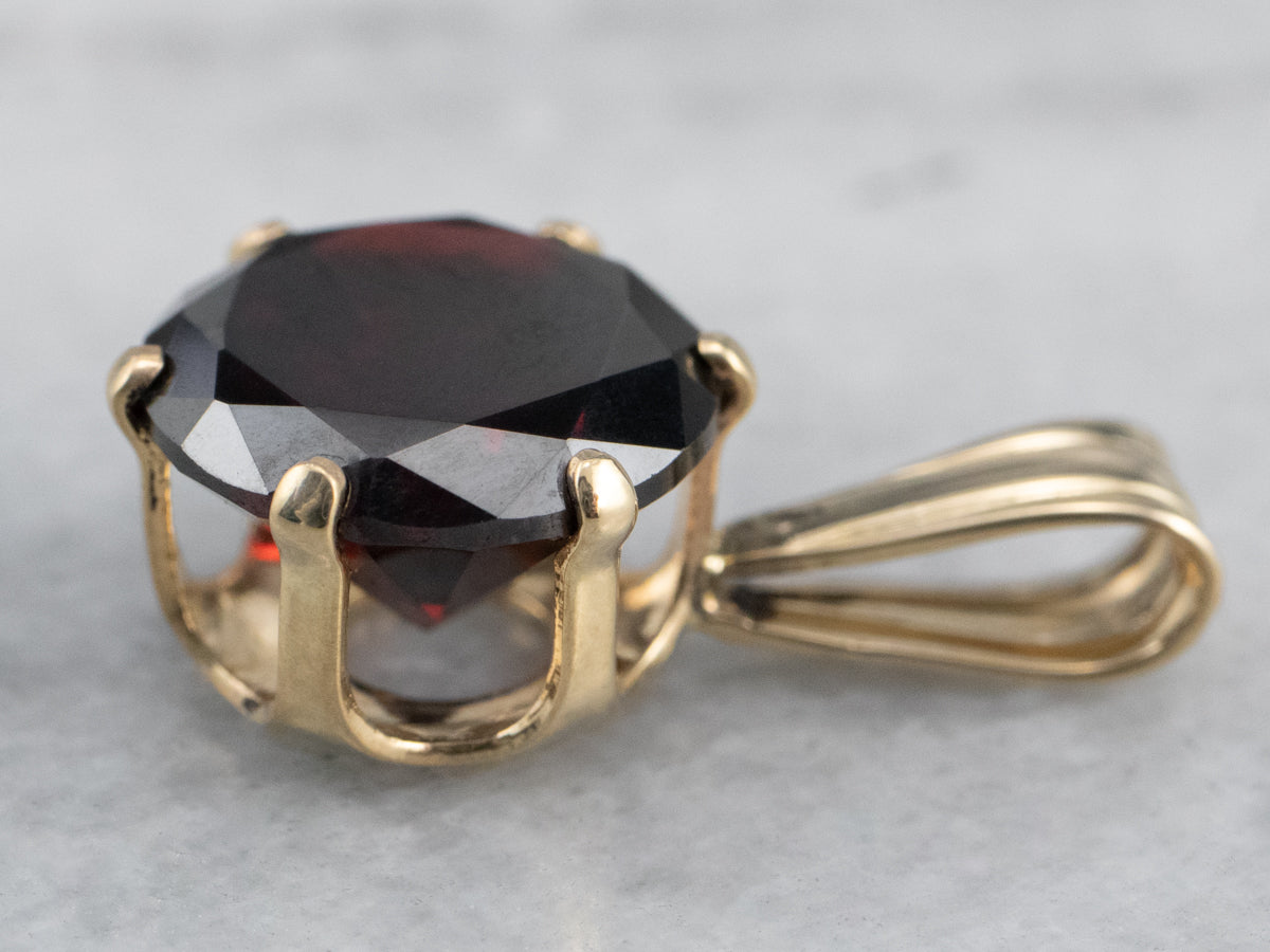 Este excepcional colgante solitario de granate simplemente cautiva a los espectadores. Mientras se usa, el profundo tono rojo sangre de la piedra capta la luz suficiente para mostrar ligeros destellos de color cereza.