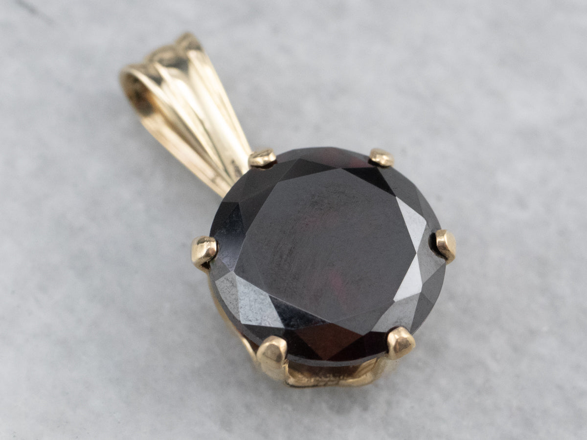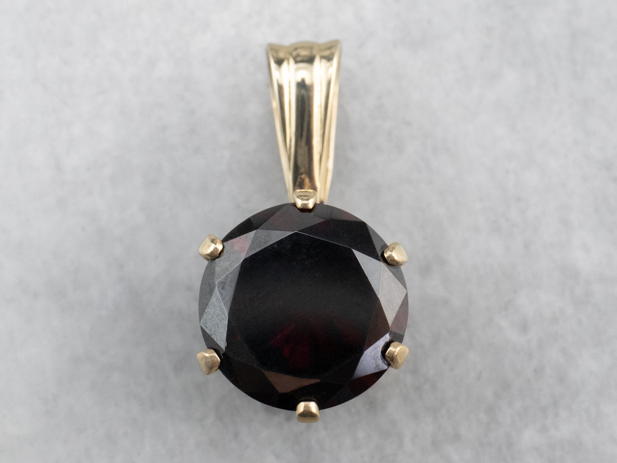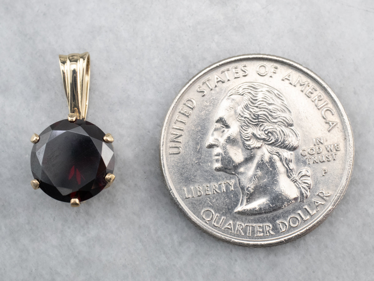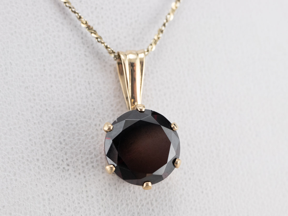 Este excepcional colgante solitario de granate simplemente cautiva a los espectadores. Mientras se usa, el profundo tono rojo sangre de la piedra capta la luz suficiente para mostrar ligeros destellos de color cereza.