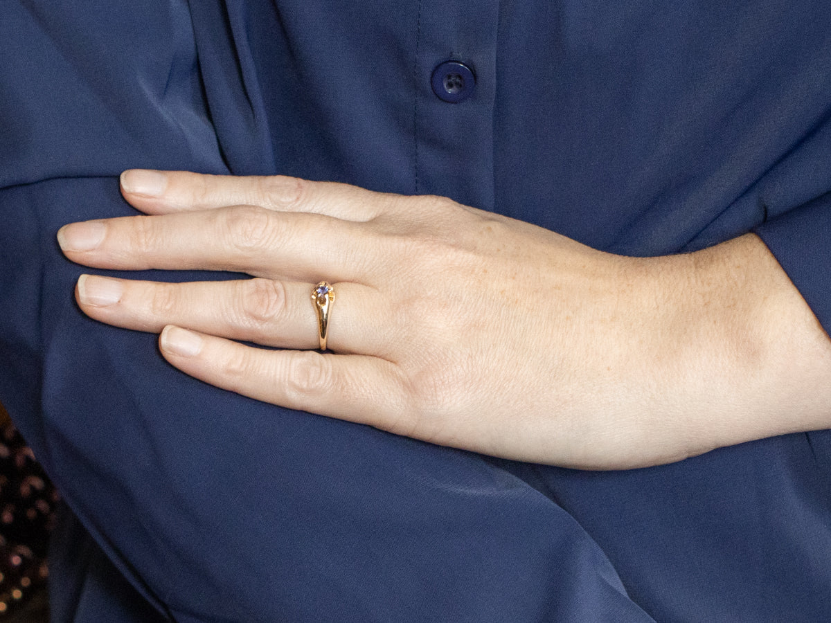 This sweet Victorian ring is set low to the hand, making it a great ring for everyday wear! Originally designed for a man's hand, the Belcher Mounting, which is named after its designer, is a mounting that underwent many variations over the years, including new, softer designs for women. This beautiful, antique ring has a lovely purple sapphire, flashing with tones of lavender and lilac!