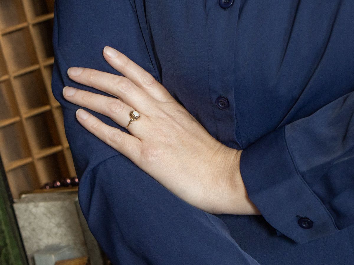 Crafted in polished yellow gold, this Australian opal shines with captivating blue, green, and red tones. Its secure bezel setting complements the ring’s elegant, streamlined design, while the oval-shaped gem gracefully enhances the length of the finger.