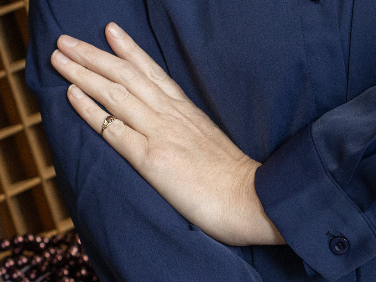 This was meant to be an engagement ring and is well-suited to the job, but one shouldn't be afraid to wear it as an everyday ring, or a stack with other rings! The simple style lends itself to a variety of ways to wear it, with the centerpiece always remaining the brilliant red stone.