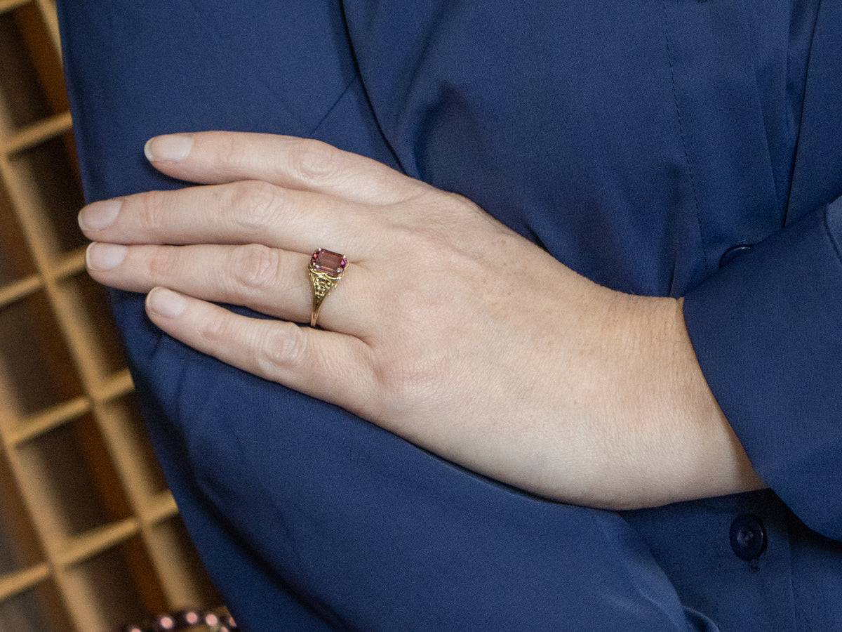 This pink tourmaline was an easy choice to set in this ring for its flashes of rose and blush pink. The emerald cut of the stone showcases its vibrance, further enhanced by the warmth of the yellow gold. Swirling openwork shoulders add an airy feel, while the rounded frame perfectly displays the tourmaline.