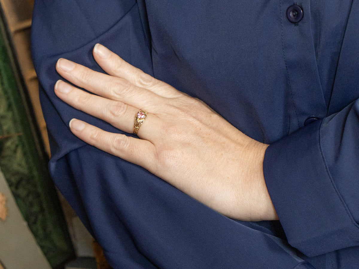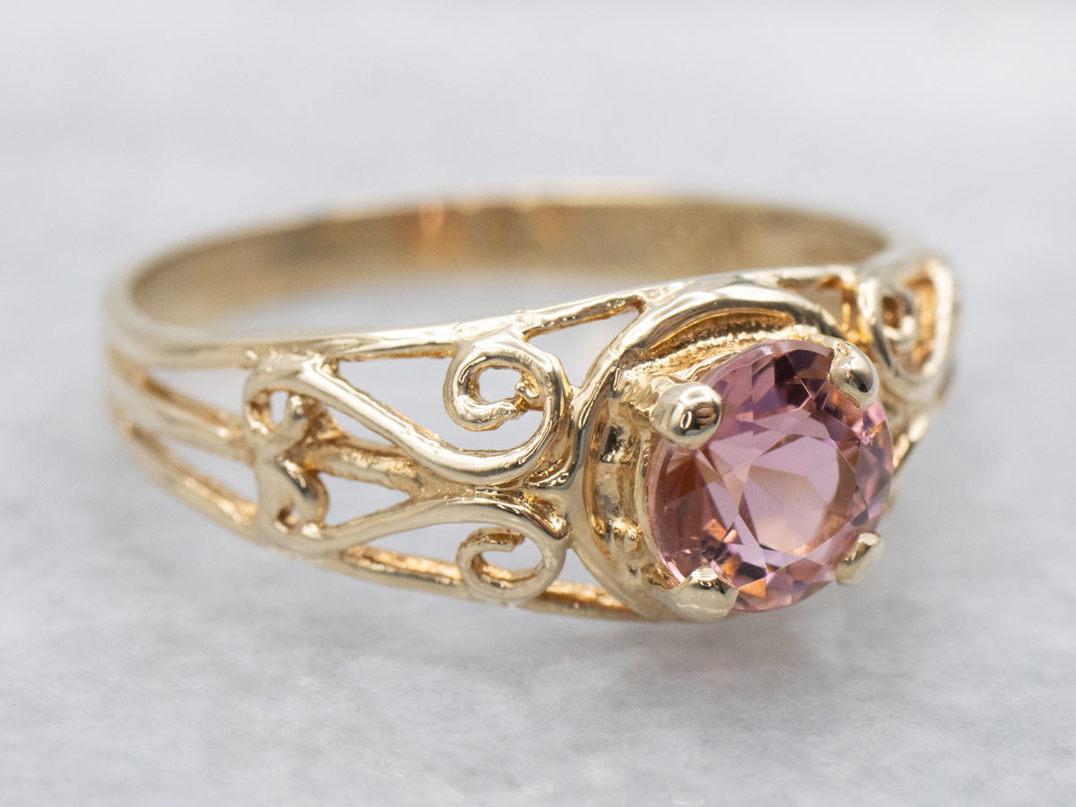 Sweet Pink Tourmaline Scrolling Gold Solitaire Ring
