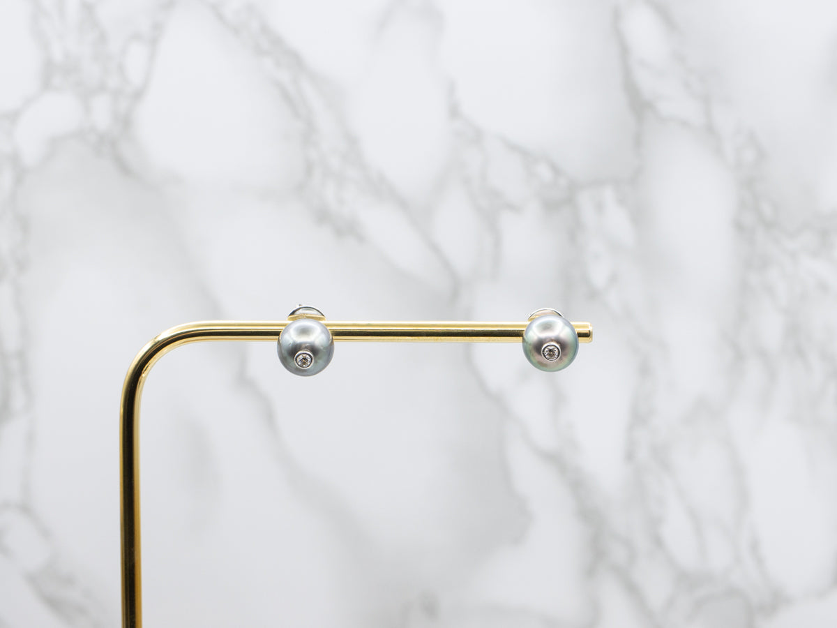 Metal: 18K White Gold Gem: 2 Grey Pearls Gem Measurements: 10.5 mm, Round Accents: 2 Diamonds totaling .18 Carats, I-J in Color, SI2 in Clarity Length of Earrings: 11.0 mm Width of Earrings: 11.0 mm Marks: "750" Stamped on the findings