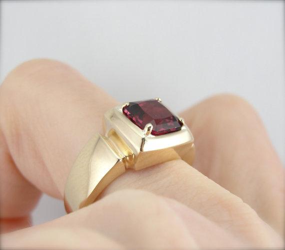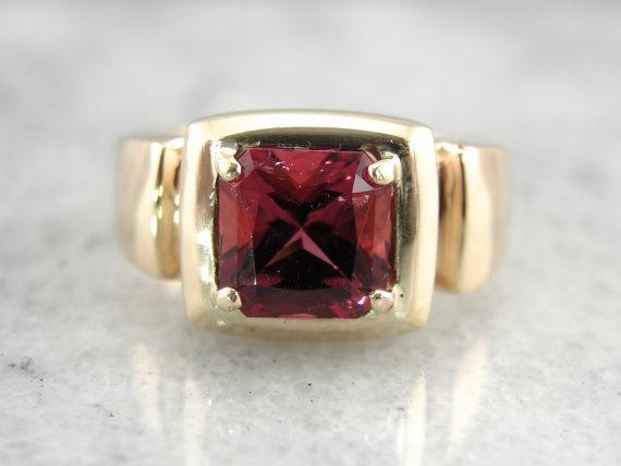 Sencillo y casi sin adornos, los hombros altamente pulidos de este anillo de la era retro evitan que sea demasiado sencillo. El bisel liso y el diseño robusto y estilizado proporcionan un marco excelente para la gran y profunda turmalina color frambuesa del centro.