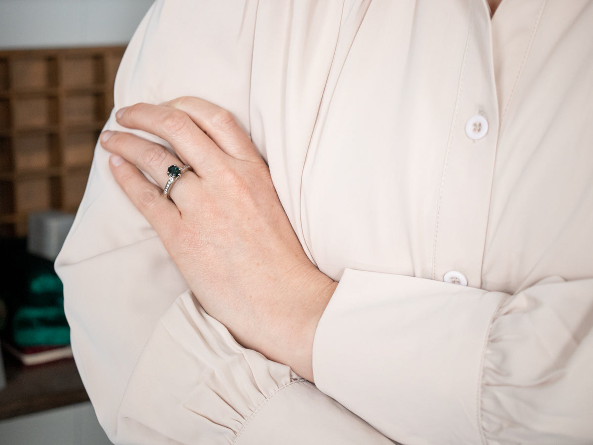 Como la aurora boreal sobre montañas de hielo resplandeciente, el verde de esta piedra preciosa de turmalina es sencillamente impresionante. El facetado de precisión resalta el brillo de esta intensa turmalina, permitiendo que los tonos más etéreos de verde brillen desde lo más profundo de la piedra. Engastado en oro blanco pulido, con incrustaciones de diamantes que crean destellos brillantes que acentúan perfectamente el rico tono de hoja perenne que es el tema principal de la piedra.