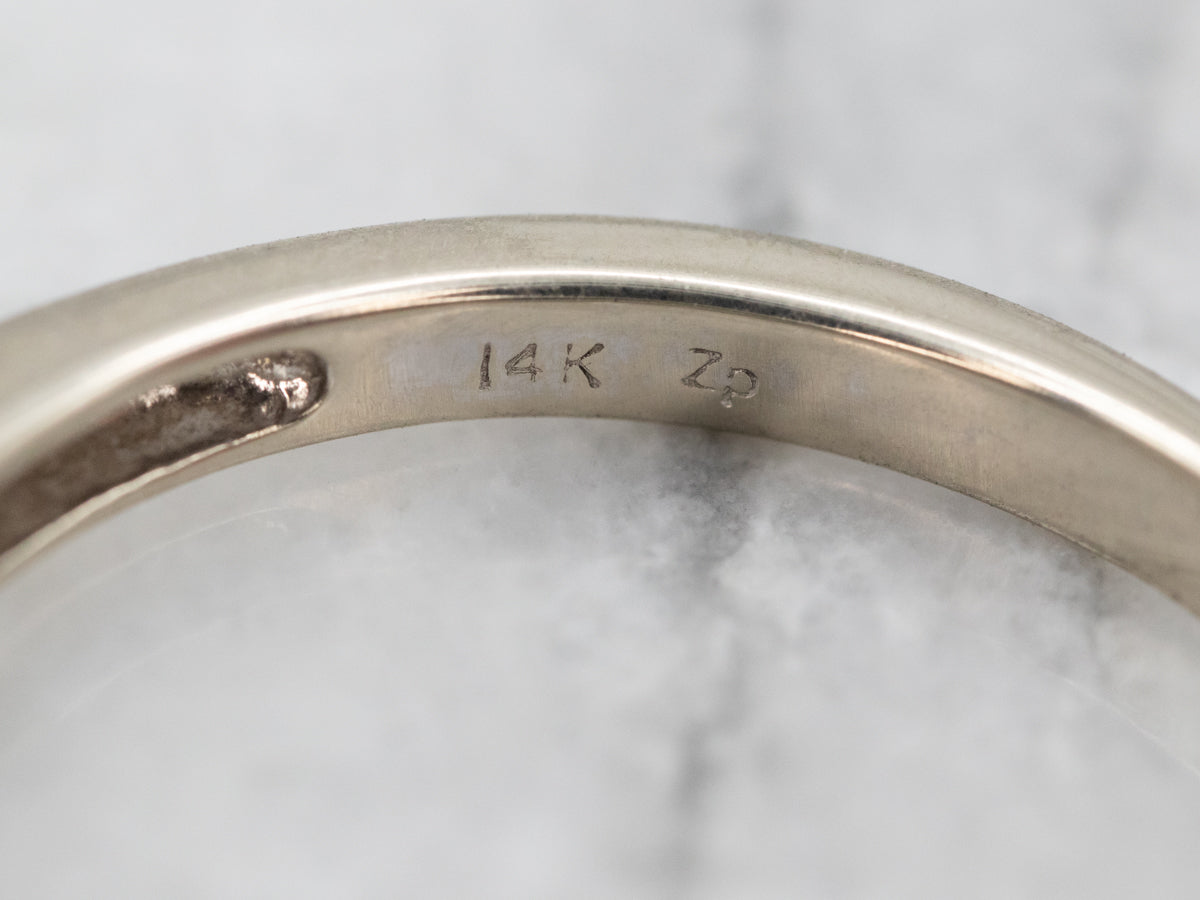 Metal: 14K White Gold Gem: Diamond .12 Carats, VS2 in Clarity, H in Color Gem Measurements: 2.7 mm, Princess Cut Accents: 2 Diamonds totaling .13 Carats, SI2 in Clarity, G-H in Color Ring Size: 5.75 Marks: "14K" Stamped on the inside band