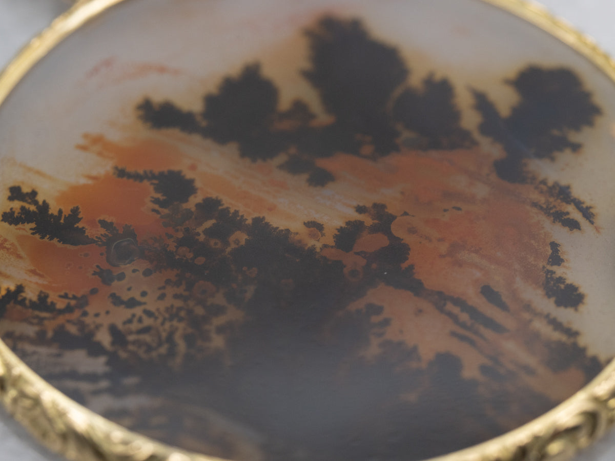 This beautiful yellow gold engraved mounting has a talismanic-like feel about it. This is a stunning dendritic agate, one that was specially cut and polished to be the perfect centerpiece and a conversation piece.