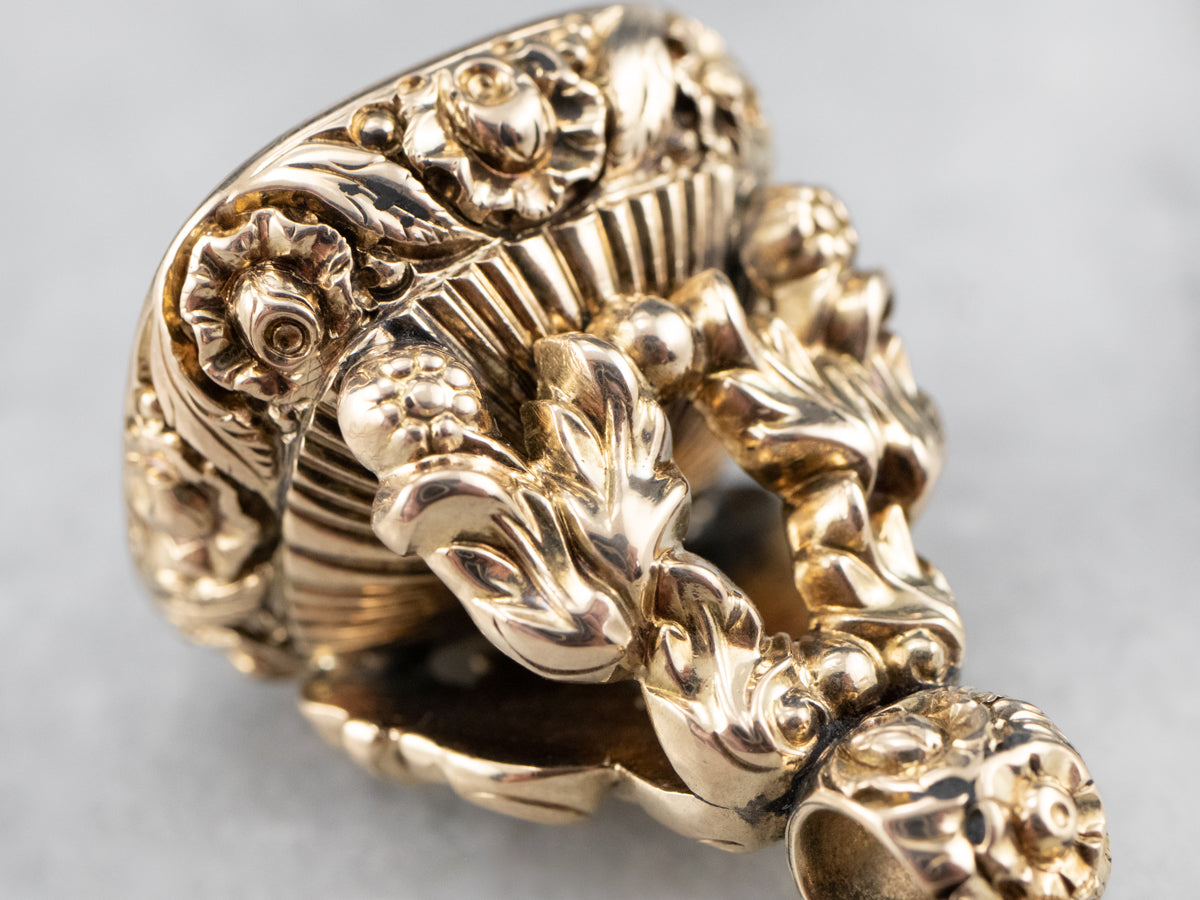 This heavy gold Victorian watch fob engraved with floral motifs has a large 10 carat citrine in the base, making for a large and gorgeous pendant when fitted with the right chain! Citrine, recognized as a masterly gem since the late 14th century, is also the birthstone for November - so why not brighten up those winter days with this bright and glowing historical pendant that's sure to stand out in a crowd!