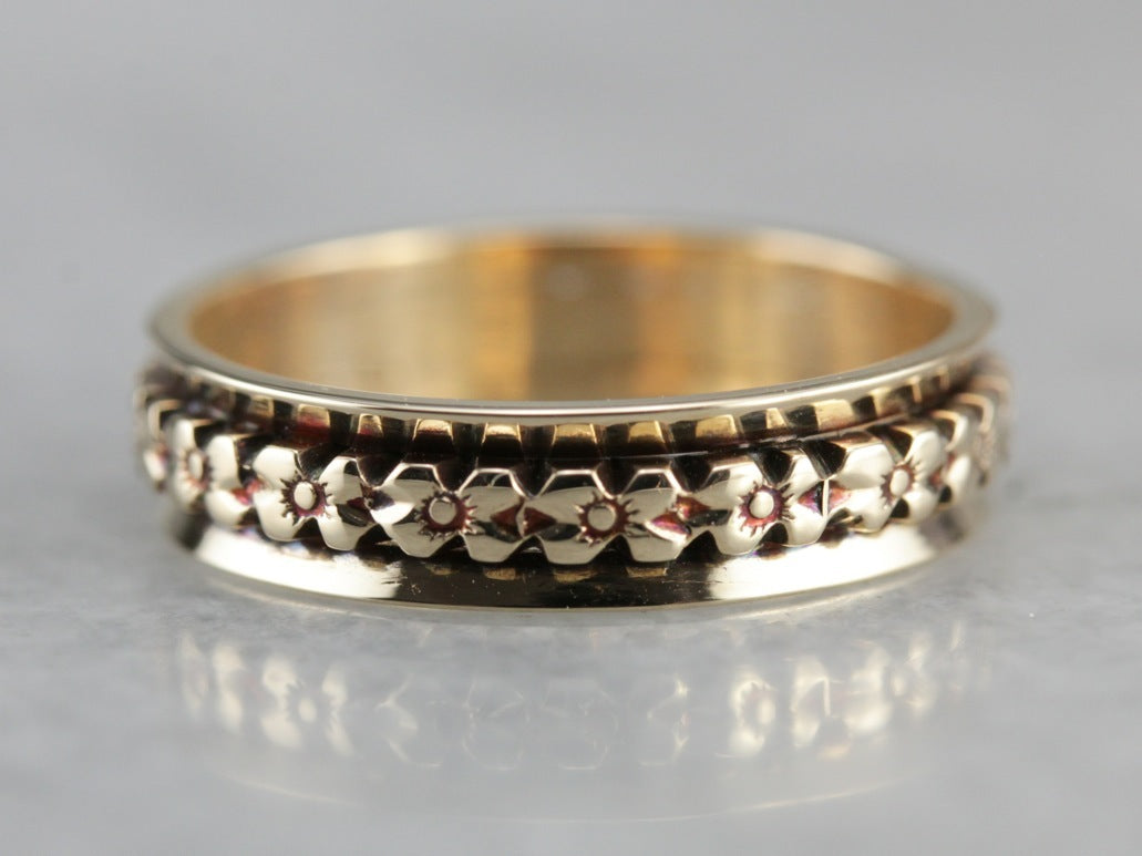 Flores de nomeolvides están talladas en el centro de esta banda antigua. Protegida por los lados dorados ascendentes, la construcción y el estilo de esta pieza hacen que no se pueda dimensionar, sin embargo, ¡es cómoda para el dedo y de excelente artesanía!