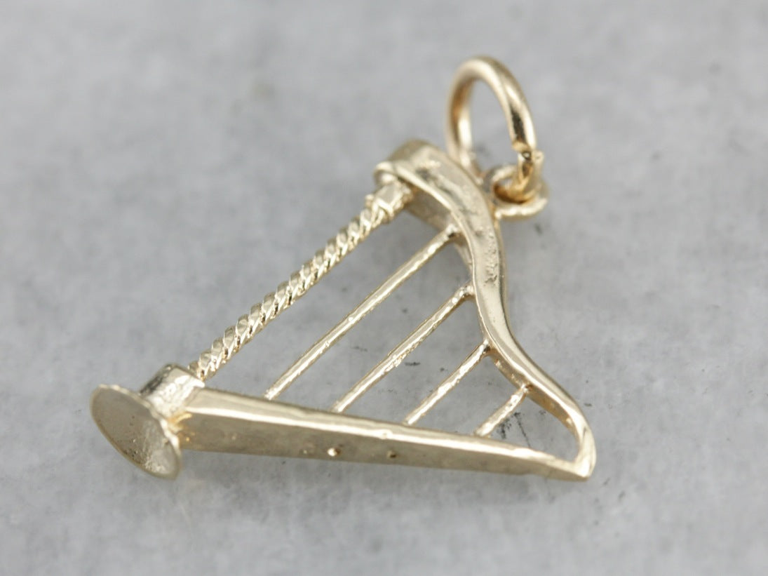 This vintage harp charm is perfect for any music lover! This handsome instrument is crafted from 10k gold and finished with a lovely twisting motif.