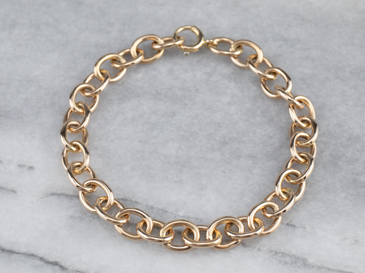 ¡Clásico y sencillo! Esta pulsera de oro de 14 quilates quedará preciosa usada sola o combinada con otras piezas. Los eslabones tienen elegantes formas de chevrón, elegantes en su forma artística.