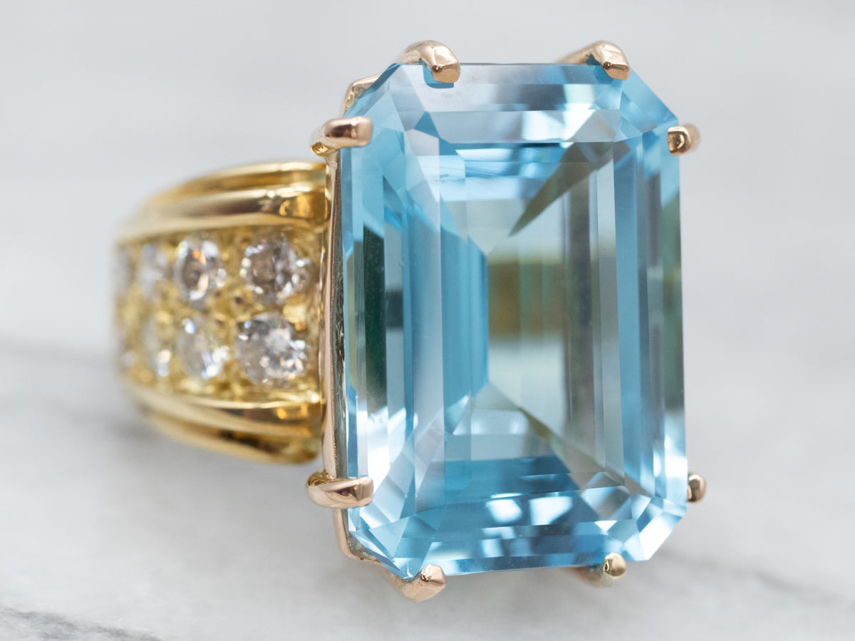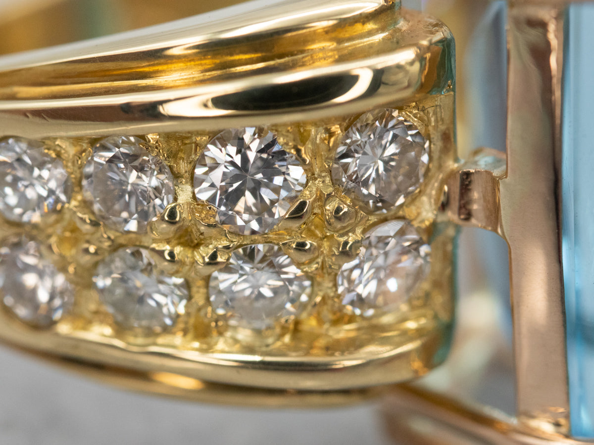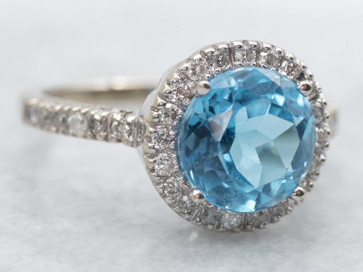 ¡Este anillo de topacio azul presenta tonos frescos y un bonito diseño! El topacio es un tono azul cielo saturado, con una hermosa claridad y un brillo brillante. La montura está elaborada en oro blanco de 14 quilates y deja pasar la luz. Los detalles de diamantes redondos añaden brillo adicional a una pieza que ya es hermosa.