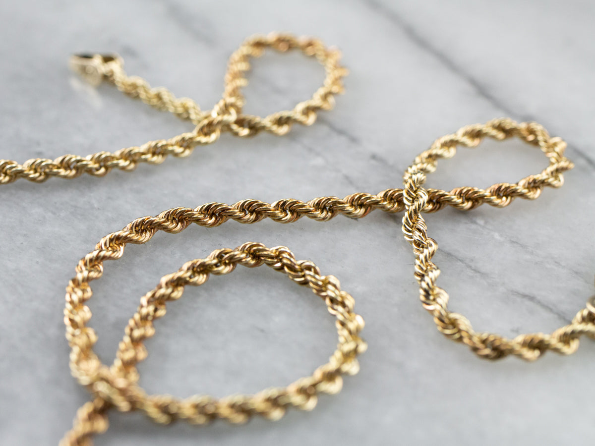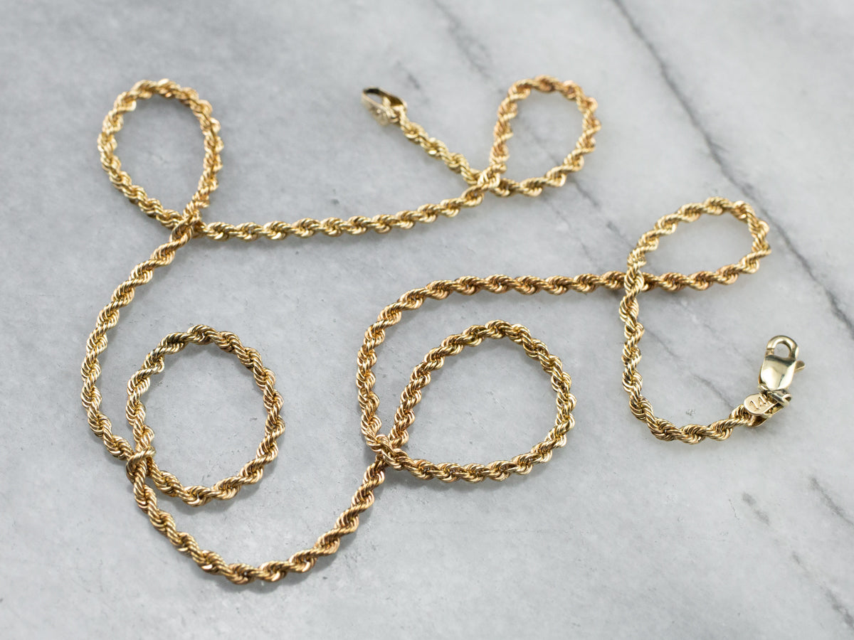 This rope chain has a fantastic polish! Bright and shining, this necklace is crafted from 14-karat gold and is the perfect in-between size of not too thick, and not too thin. This versatile piece is sure to become a staple in your collection!