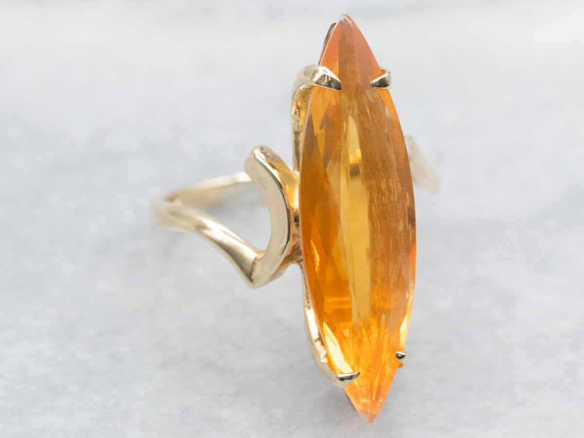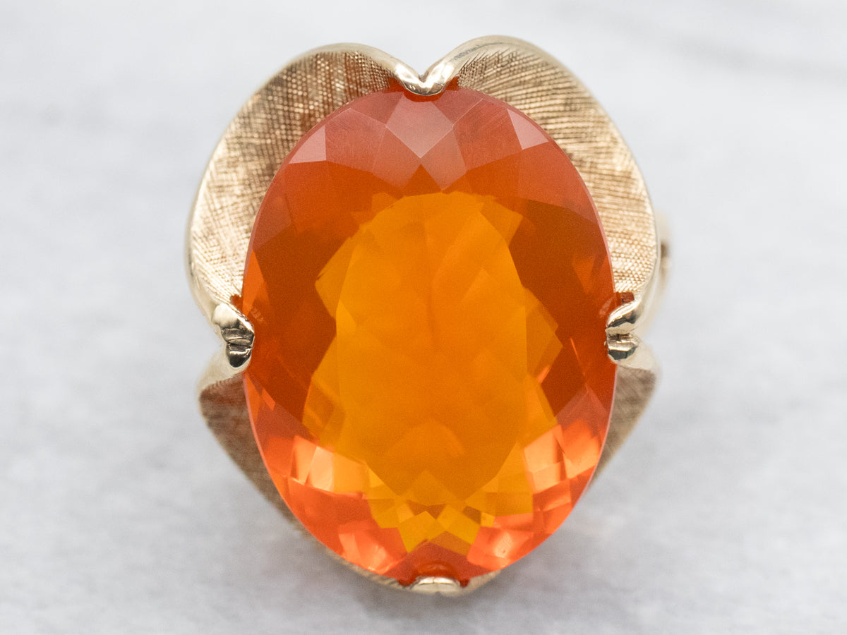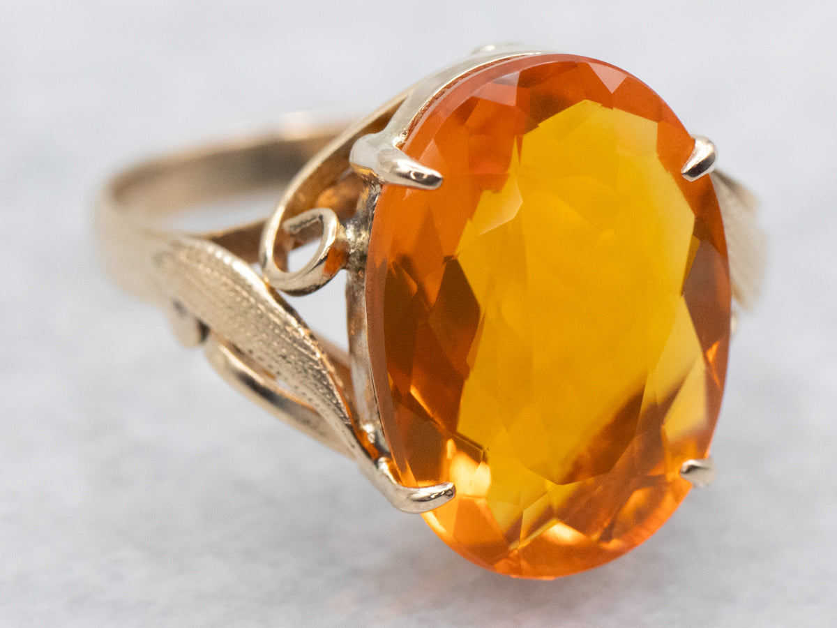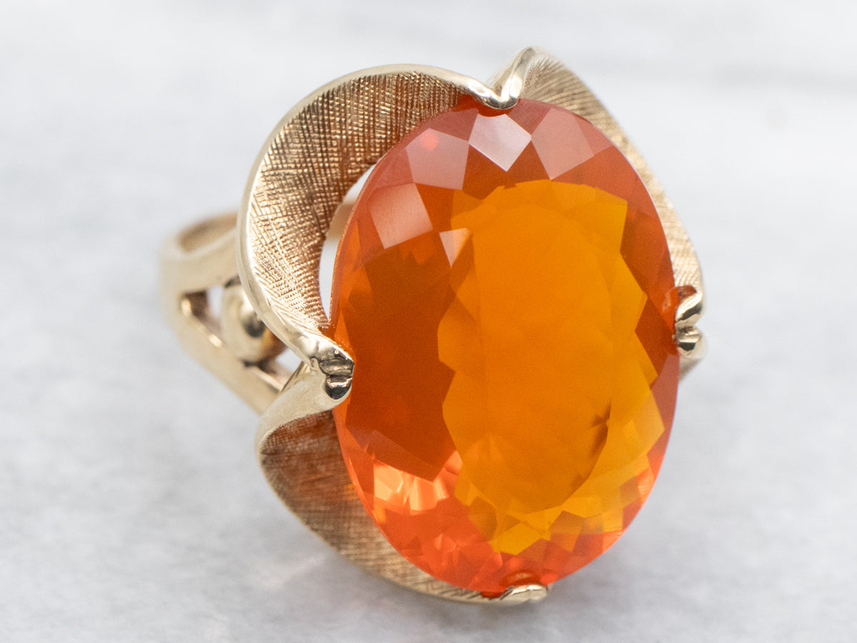 ¡Este anillo de ópalo de fuego tiene una hermosa simplicidad! Esta gema es de un vibrante color naranja neón, con un brillo sutil que parece brillar desde dentro. ¡Un engaste solitario retorcido de oro amarillo de 14 quilates acentúa muy bien los tonos cálidos del ópalo!