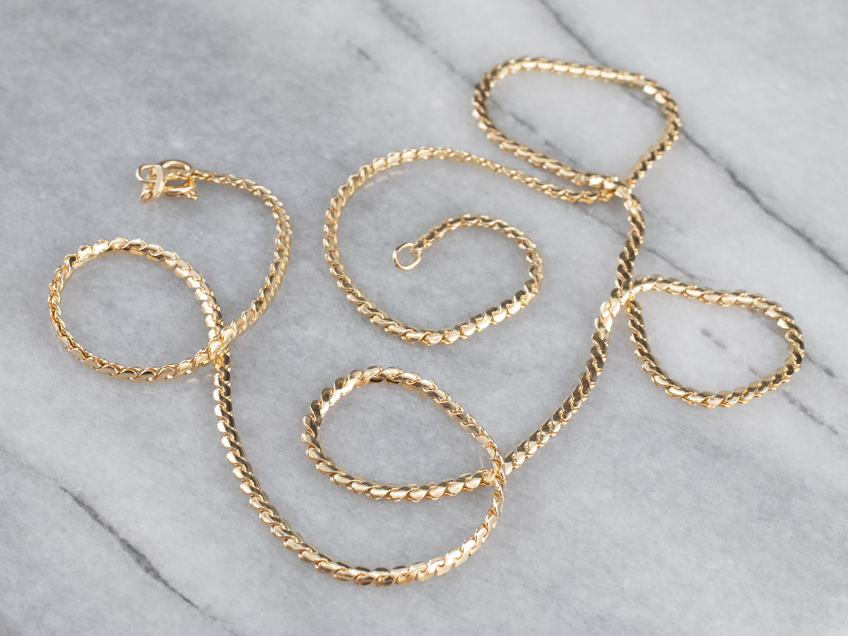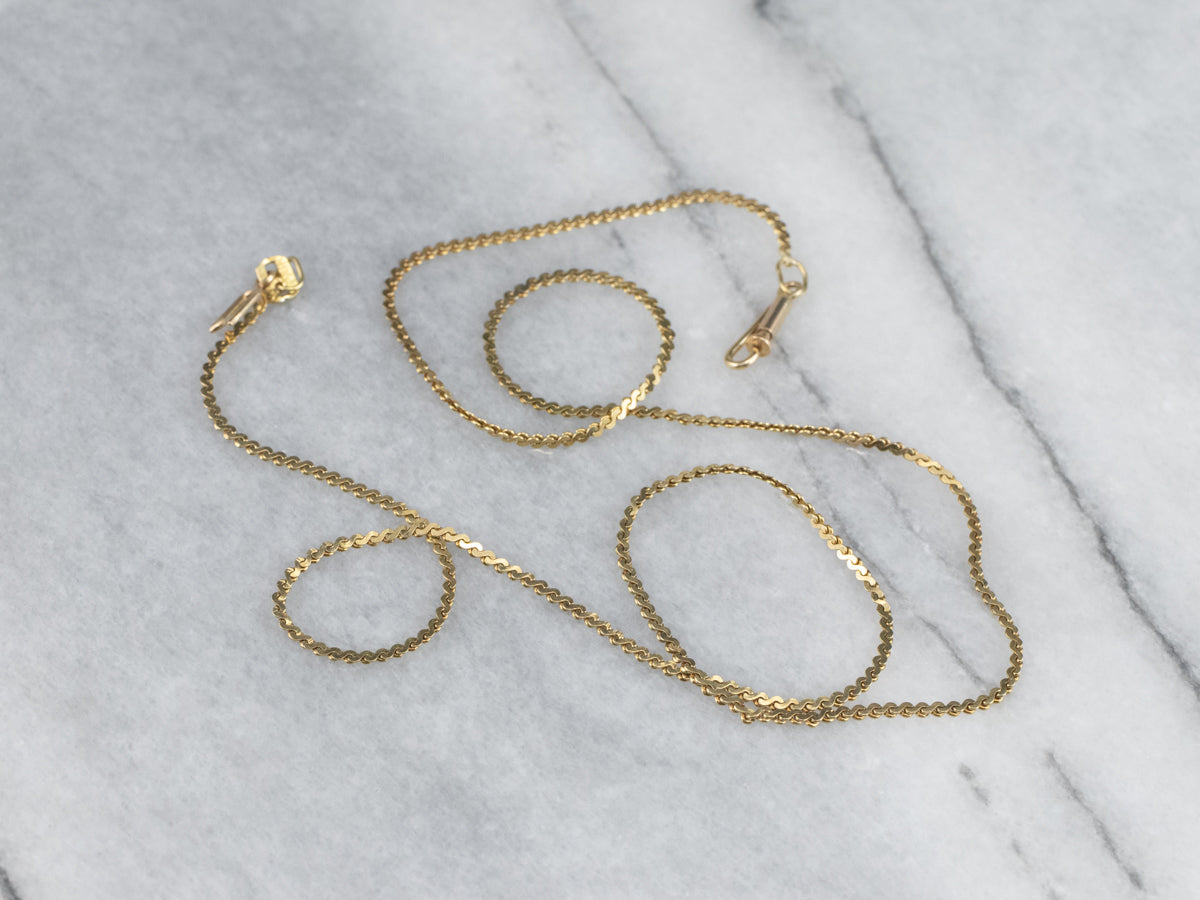 This serpentine chain is made from 14 karat yellow gold and has a beautiful high polish. The "s" shaped links are designed to lay flat against the chest for comfortable wear. Wear this necklace alone for a minimalist look, or pair it with your favorite pendant!