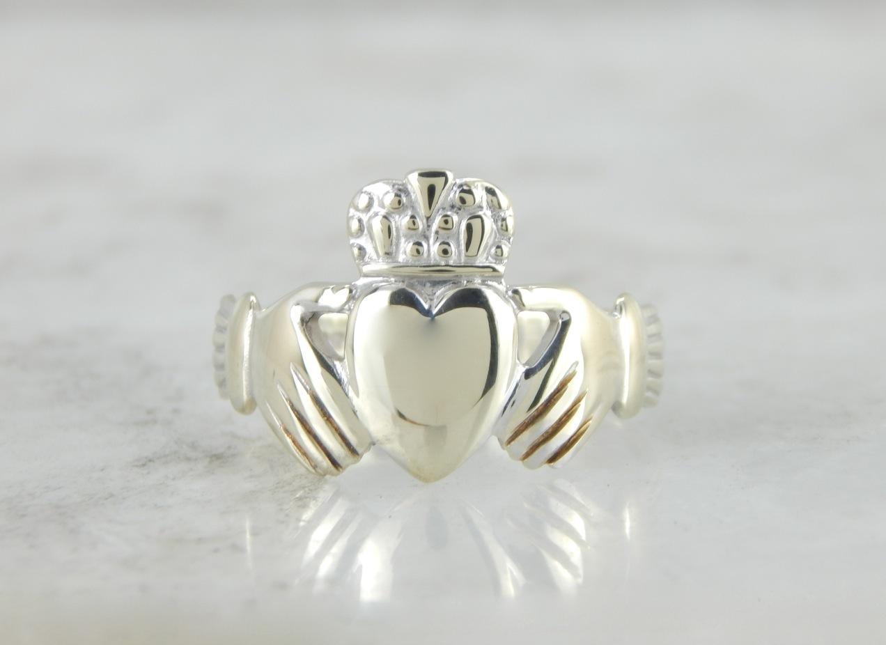Betrothal rings depicting two clasped hands date back many centuries in European history. The Irish version, the Claddagh ring, came about in the 1600's and has been produced continually since that time. This is a more modern take on a classic, and yet has an even more ancient feel, thanks to the polished white gold.