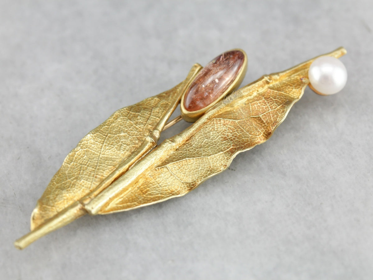 This beautiful piece by Ann Krupp is handmade with gold cast leaves. A rosy hued Oregon sunstone and bright white pearl add lovely touches to this natured inspired brooch.