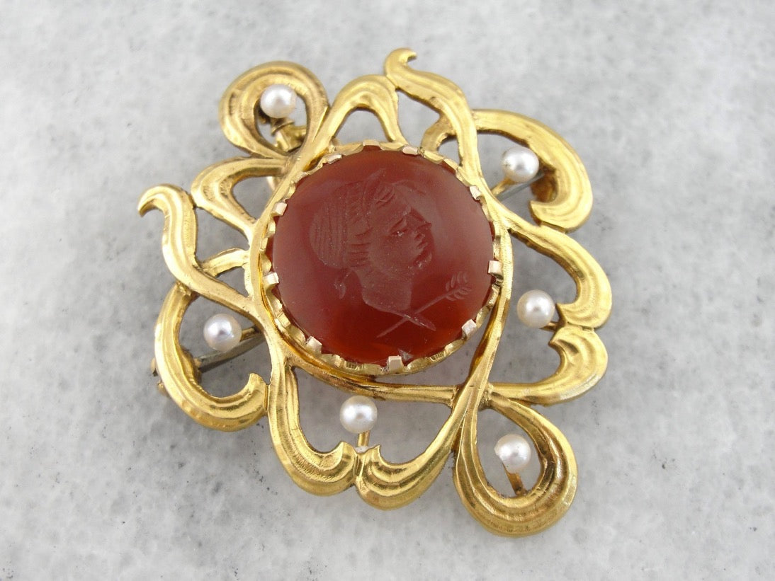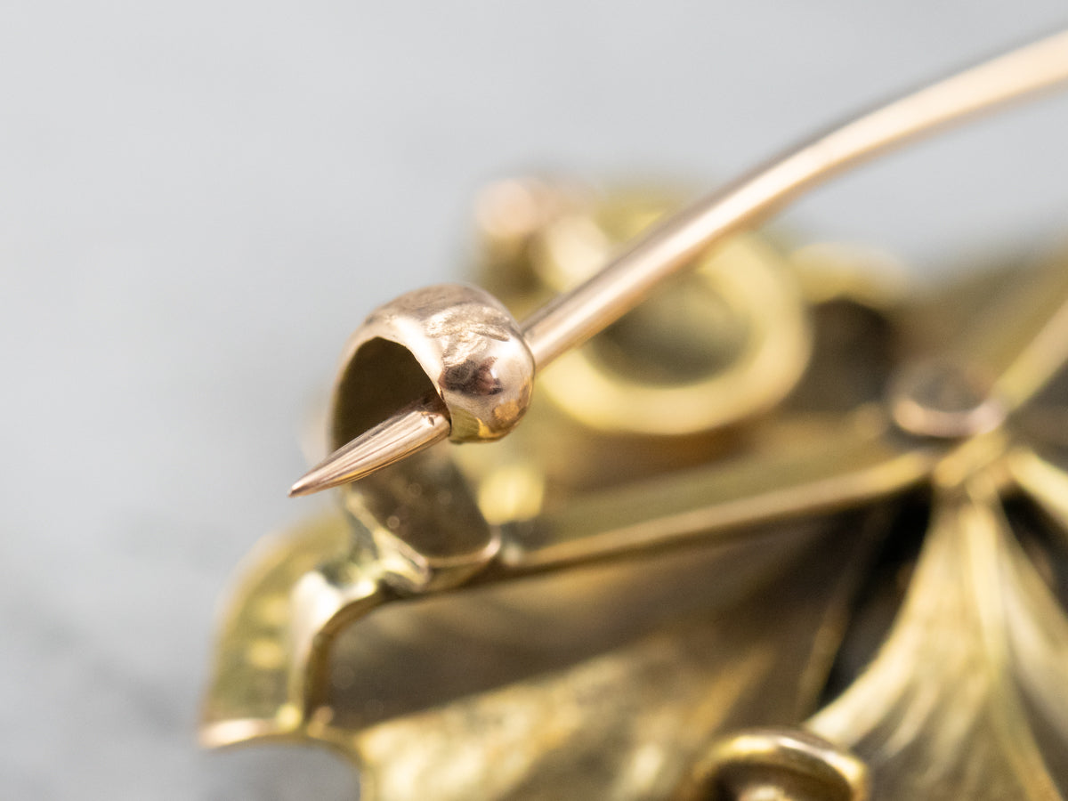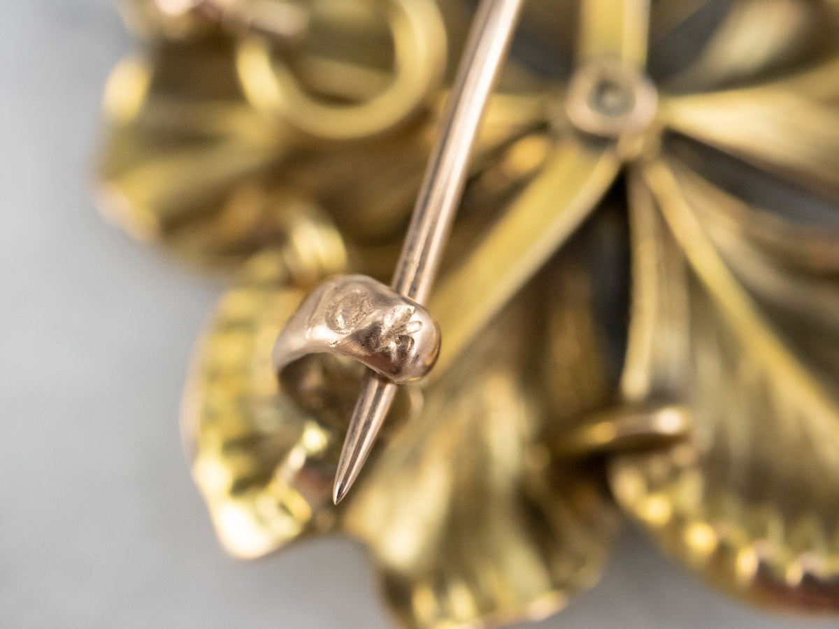 The style of this antique pin or pendant is romantic and natural, classic of the Art Nouveau/Belle Époque era. The flower depicted is a pretty dogwood flower, set in the center with a natural baroque pearl. The details of this piece are exquisite, with a stunning lifelike design!
