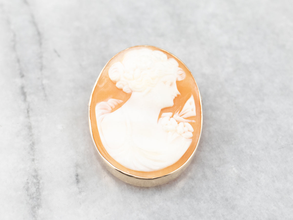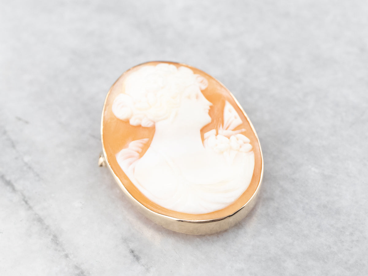 This cameo features wonderful, crisp details, and a great contrast between the creamy white carving and the soft russet of the background. A string of seed pearls pulls the piece together, drawing on the color of the profile and the floral details of the gold.