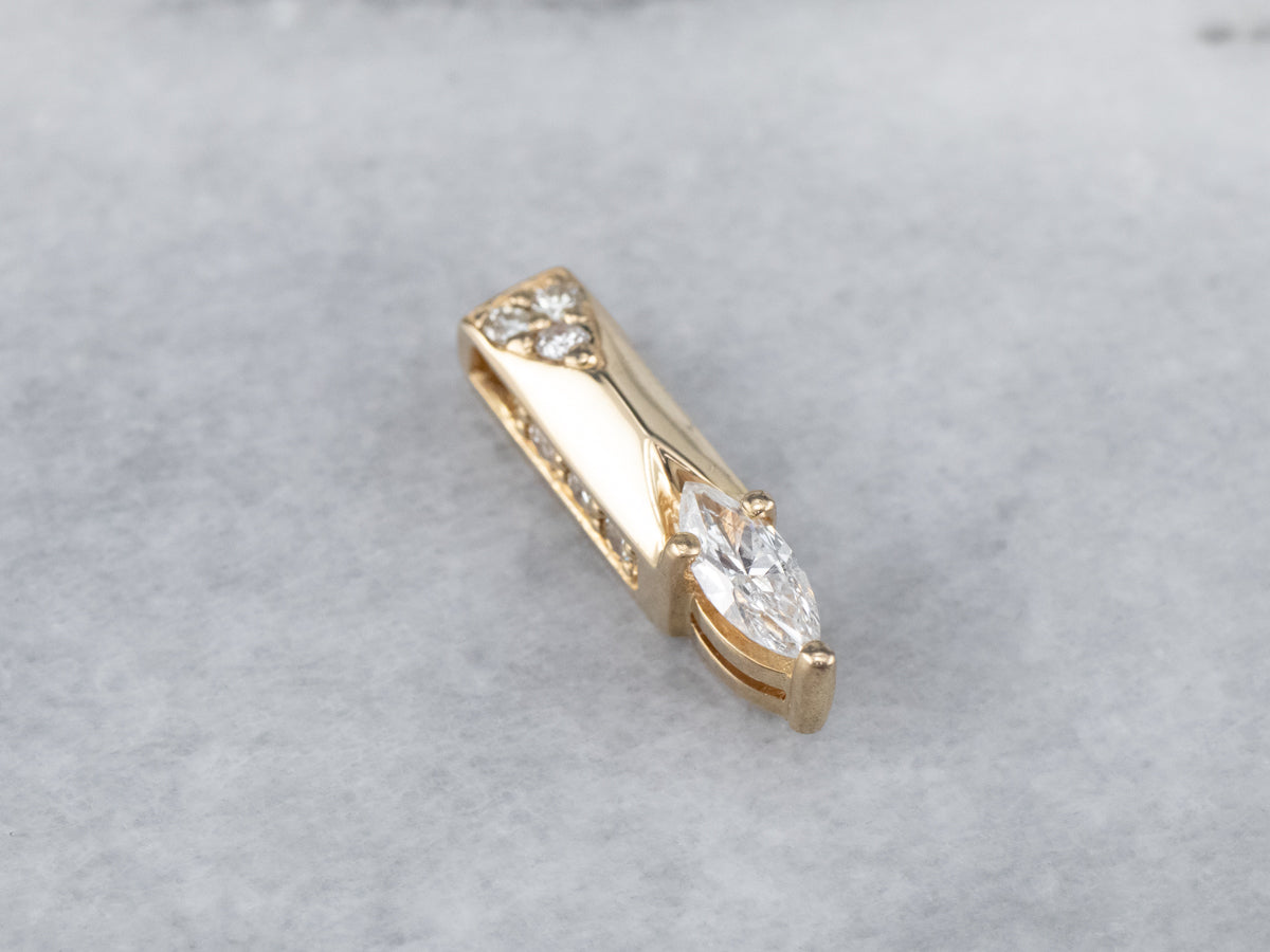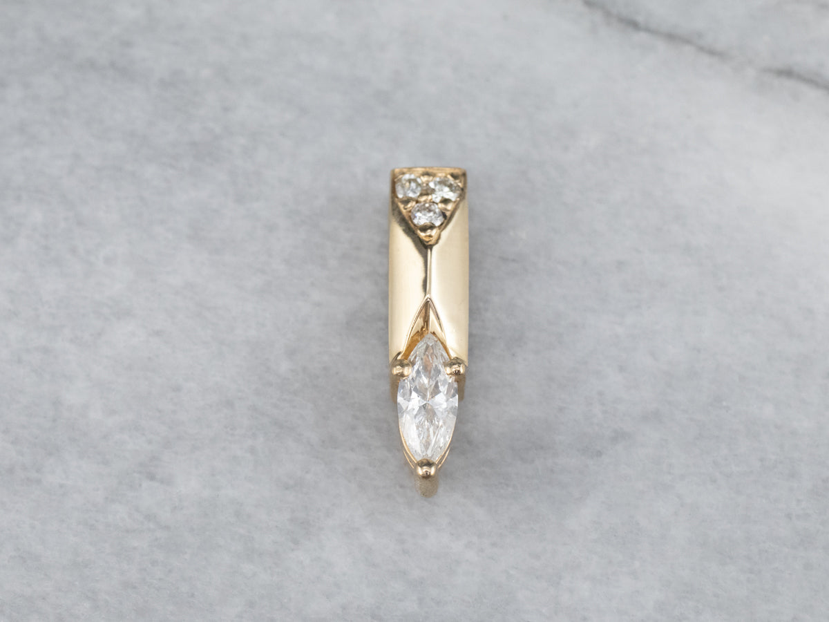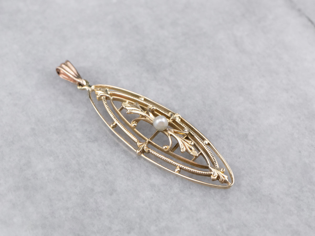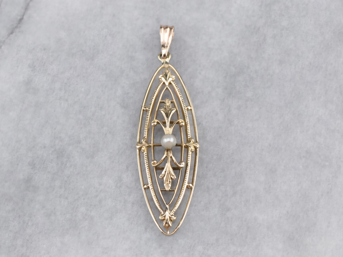 We've set this stunning filigree pendant from the early 1900's with a sophisticated marquise cut diamond that mimics the elongated silhouette of the pendant. The filigree is in beautiful condition and gives the piece a light and delicate look!