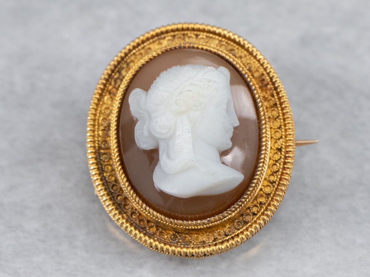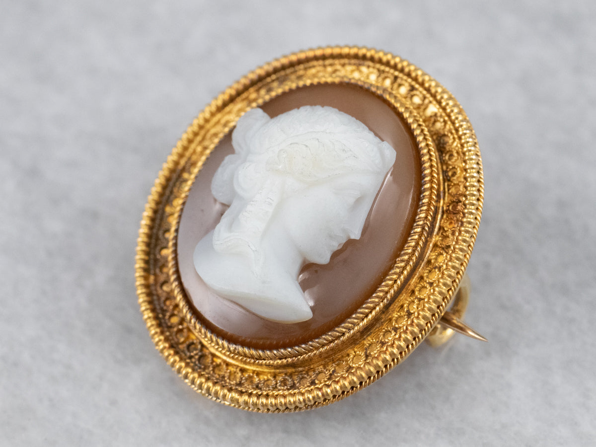 Crafted in the late 1800s, this antique cameo pendant features delicate milgrain and beadwork, bloomed gold, and styling that is the hallmark of the Etruscan Revival style. The ruddy red and white stone cameo is hand-carved, depicting a portrait of a Roman soldier in traditional garb.