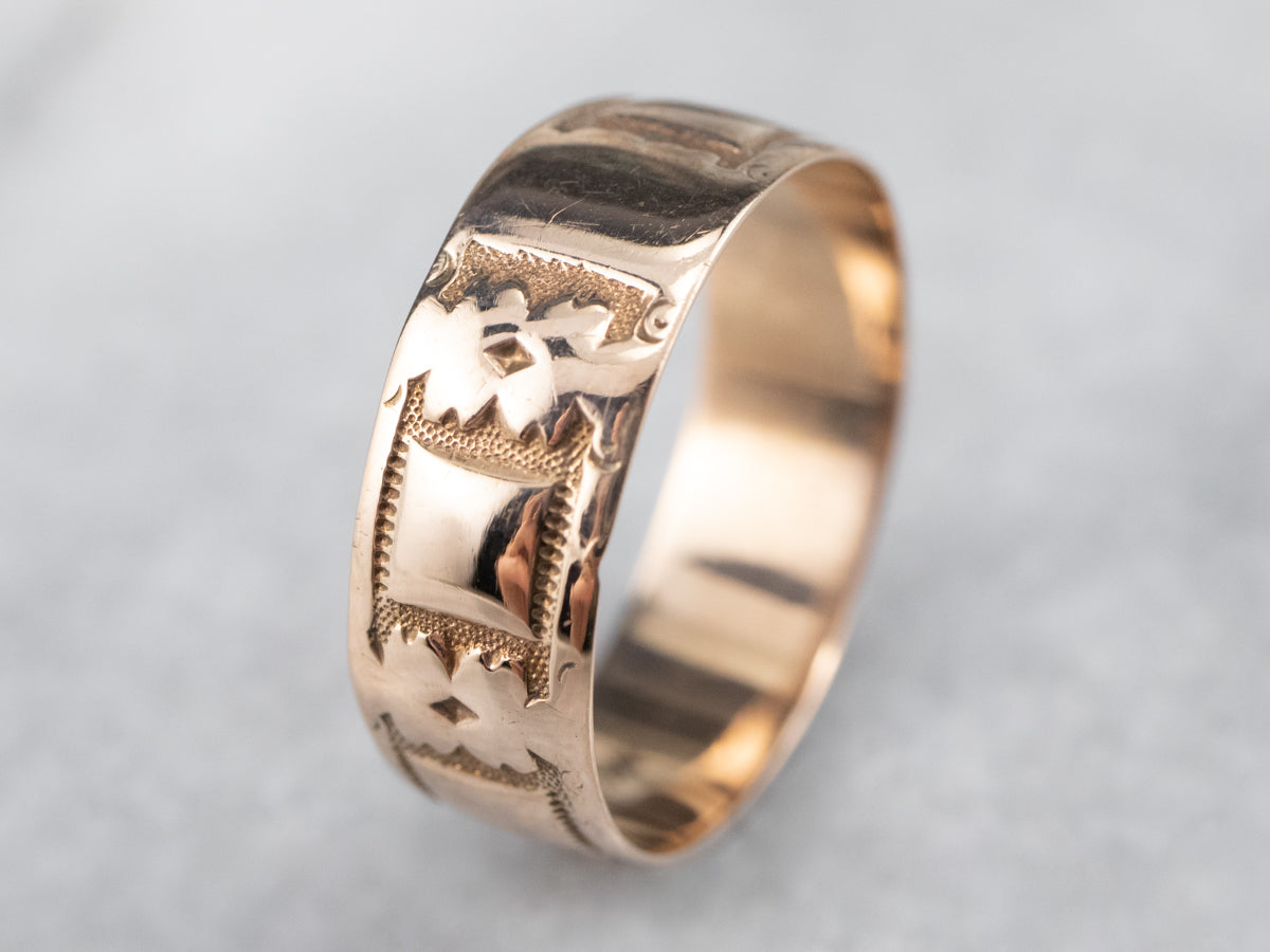This antique cigar band still has its original monogram: a beautifully engraved stylized combination of the letters H, C, and S. The straight sided design of this ring is ideal for stacking, but also looks wonderful worn on its own!