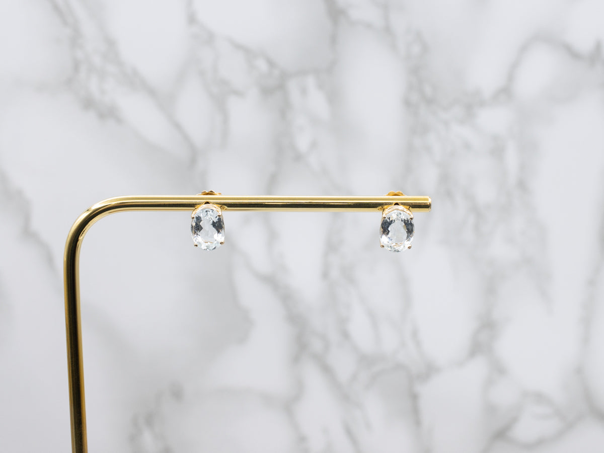 Metal: 14K Yellow Gold Gem: 2 Aquamarine totaling 5.00 Carats Gem Measurements: 7.9 x 10.6. mm, Oval Cut Length of Earrings: 11.0 mm Width of Earrings: 8.0 mm Marks: "14K CU" Stamped on the findings