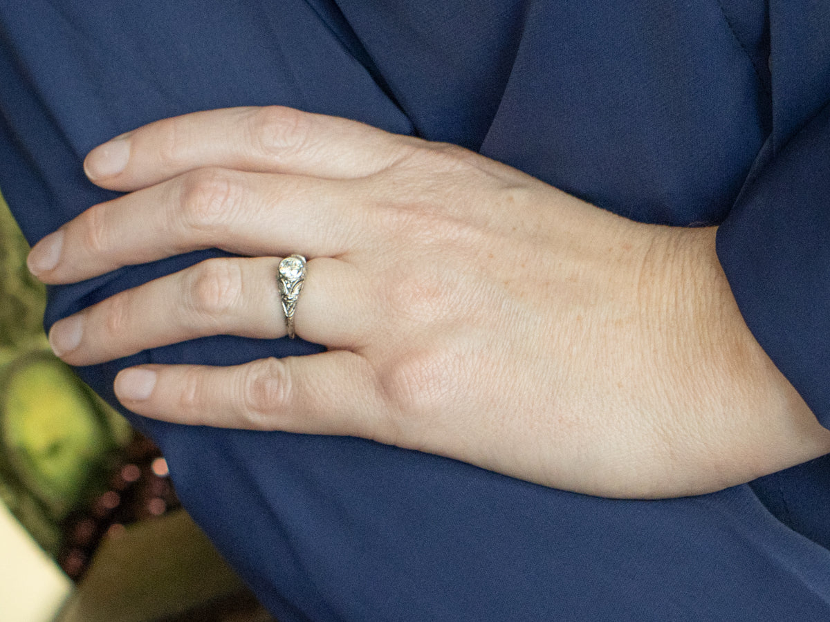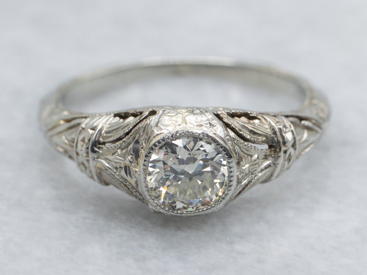 Elevate your love story with this stunning Art Deco Diamond Engagement Ring, where timeless elegance meets modern sparkle. Featuring a brilliantly newly set diamond secured in a classic bezel setting, this piece showcases intricate hand-engraved detailing on lustrous gold. A perfect blend of antique charm and contemporary craftsmanship, it's the ring that says "I do" with style and sophistication.