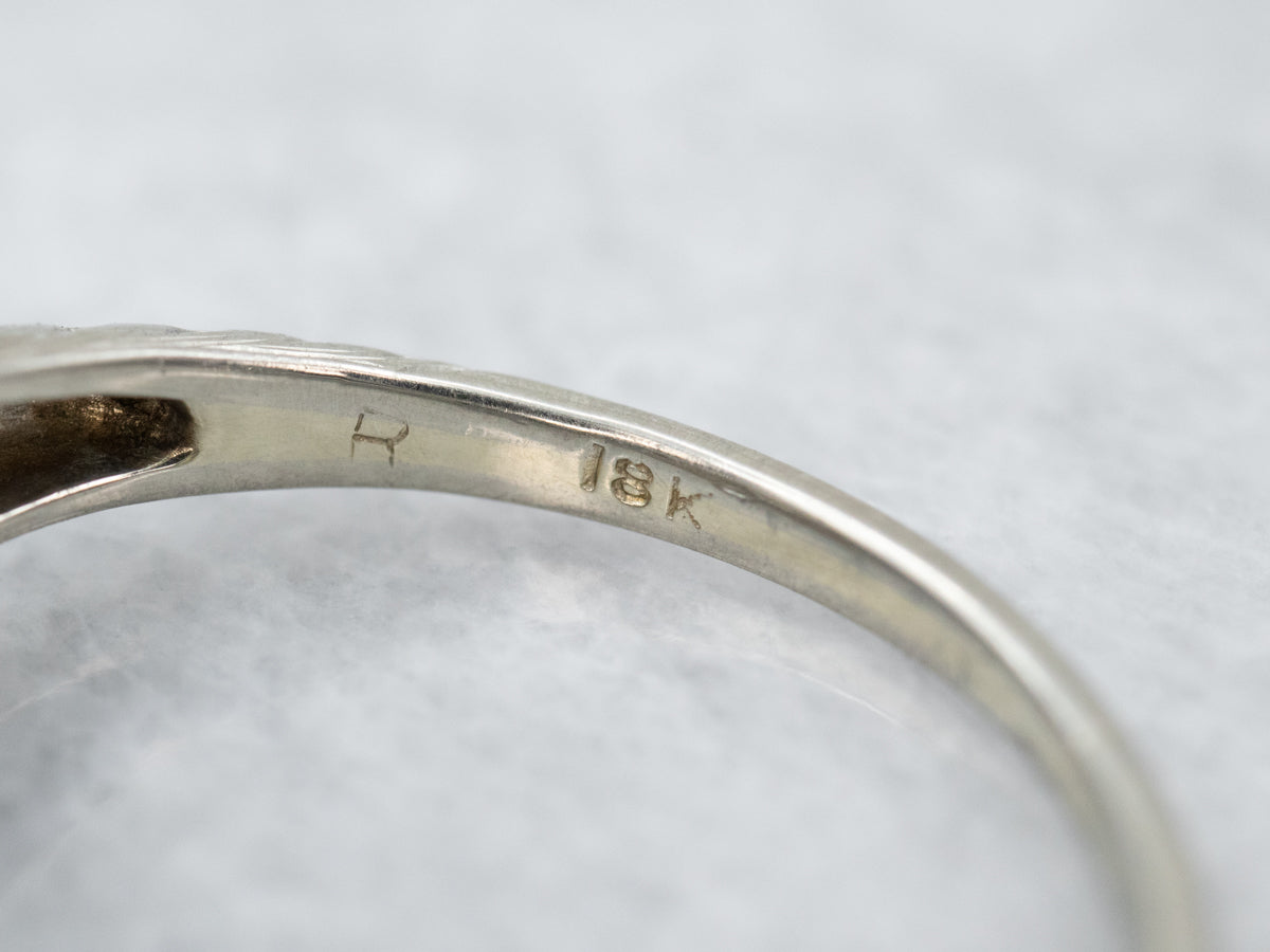 This is a lovely confection of a diamond and deep blue sapphires, set into bright crisp white 18-karat gold! This ring has all the characteristics of an Art Deco ring! The center is set with a sweet round-cut diamond, with triangle-cut synthetic sapphires on either side, an iconic design of the Art Deco era!