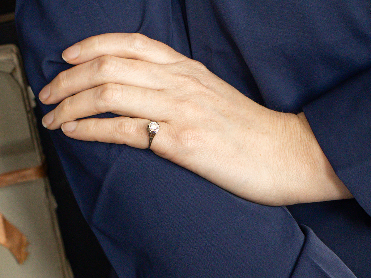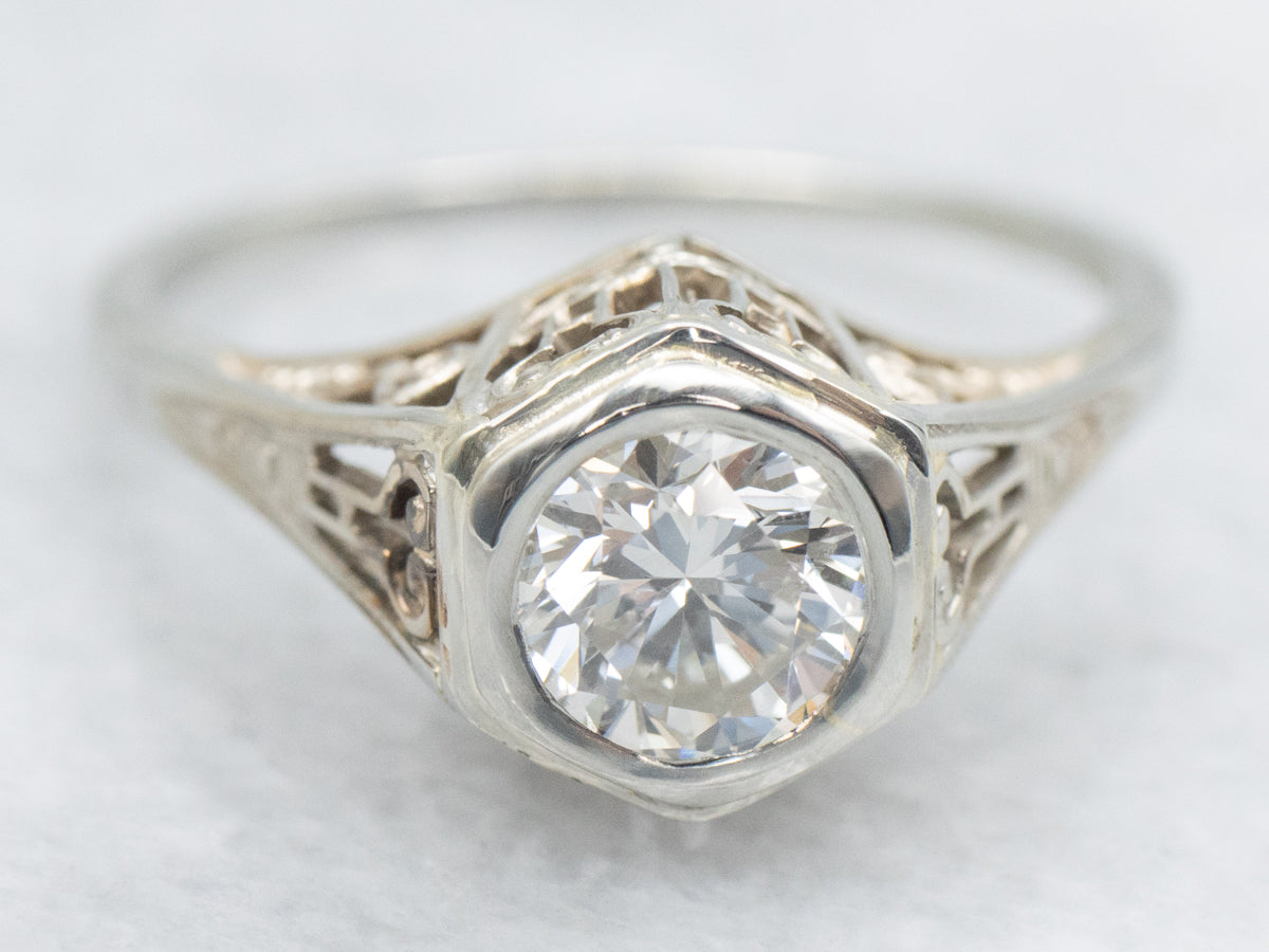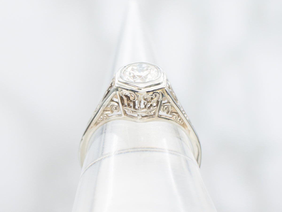 Class, sophistication, and timeless quality. All of these adjectives come to mind when trying on this ring! This is a classic Art Deco engagement ring, with scrolling filigree, that beautifully accents the pretty newly set sparkling round brilliant diamond center!