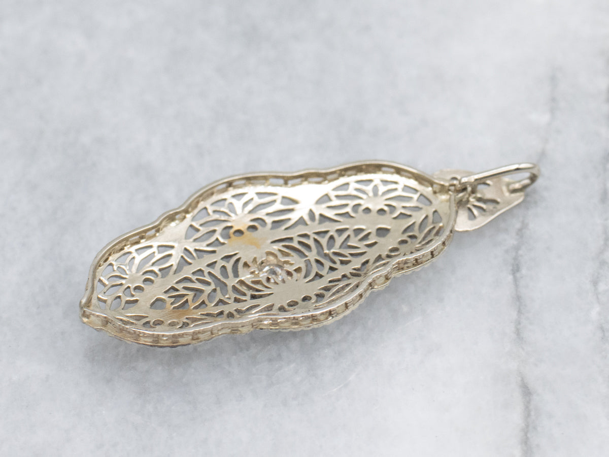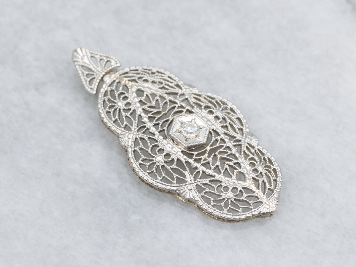 This exquisite bit of Art Deco finery started as a diamond brooch but has been transformed into a wearable pendant! The filigree work is spectacular and full of elegant lines and fine details. A single diamond makes for a sparkling accent, its icy flashes popping against the bright gleam of the metal.