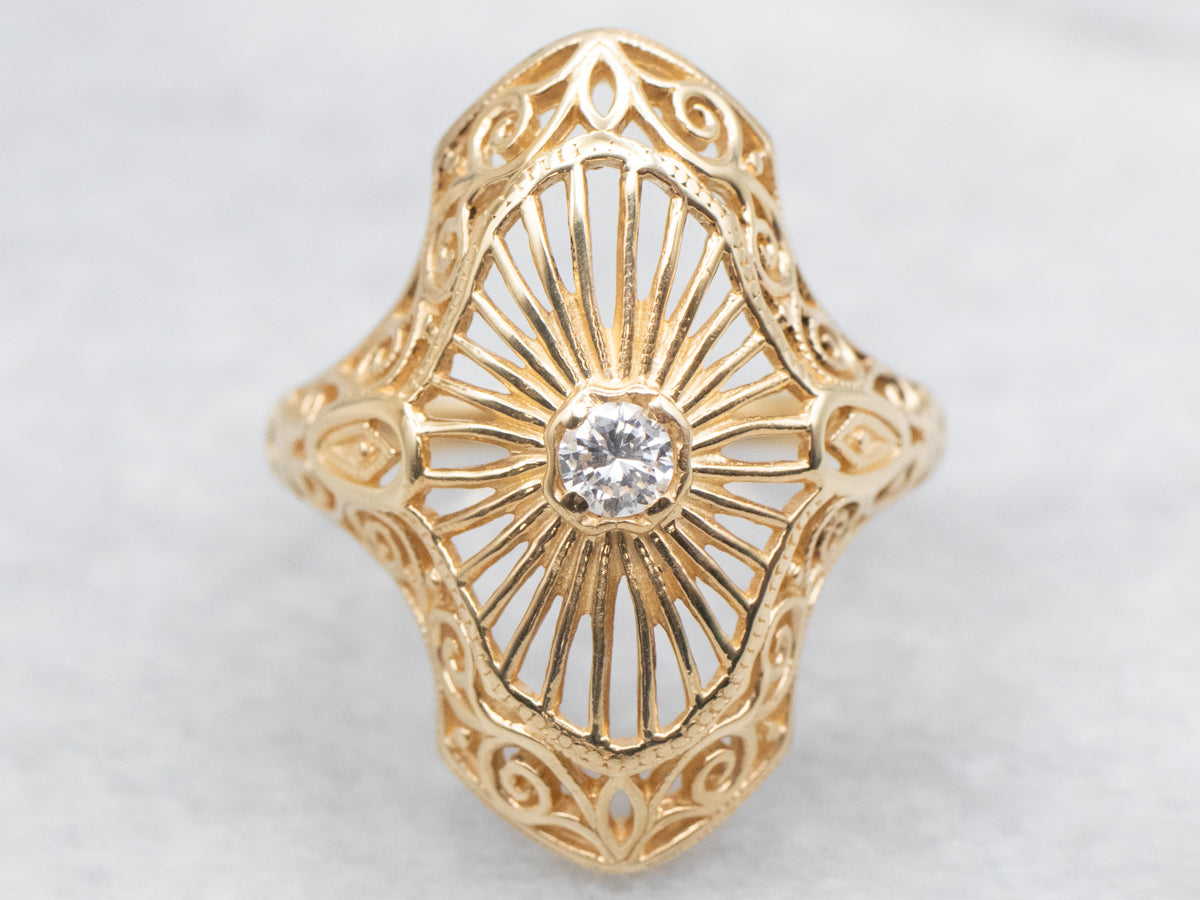 This lovely ring is crafted of patina white gold, with wonderful Art Deco engravings and floral motifs around the edge. The center is a faceted, perfectly polished rectangle of Hematite, a highly reflective gray stone with plenty of shine!