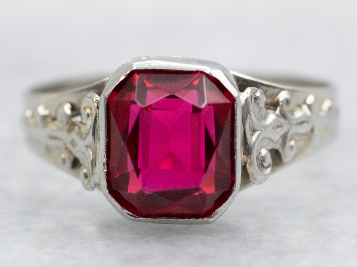 We set this exquisite ring with an emerald cut peridot in a stunning Art Deco era filigree shank. Crafted of white gold, this ring is sure to make a statement and add a touch of sophistication to any outfit.