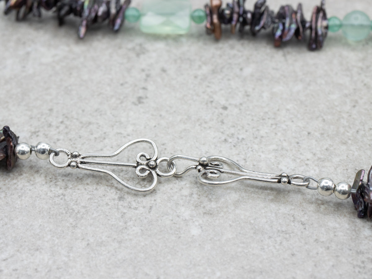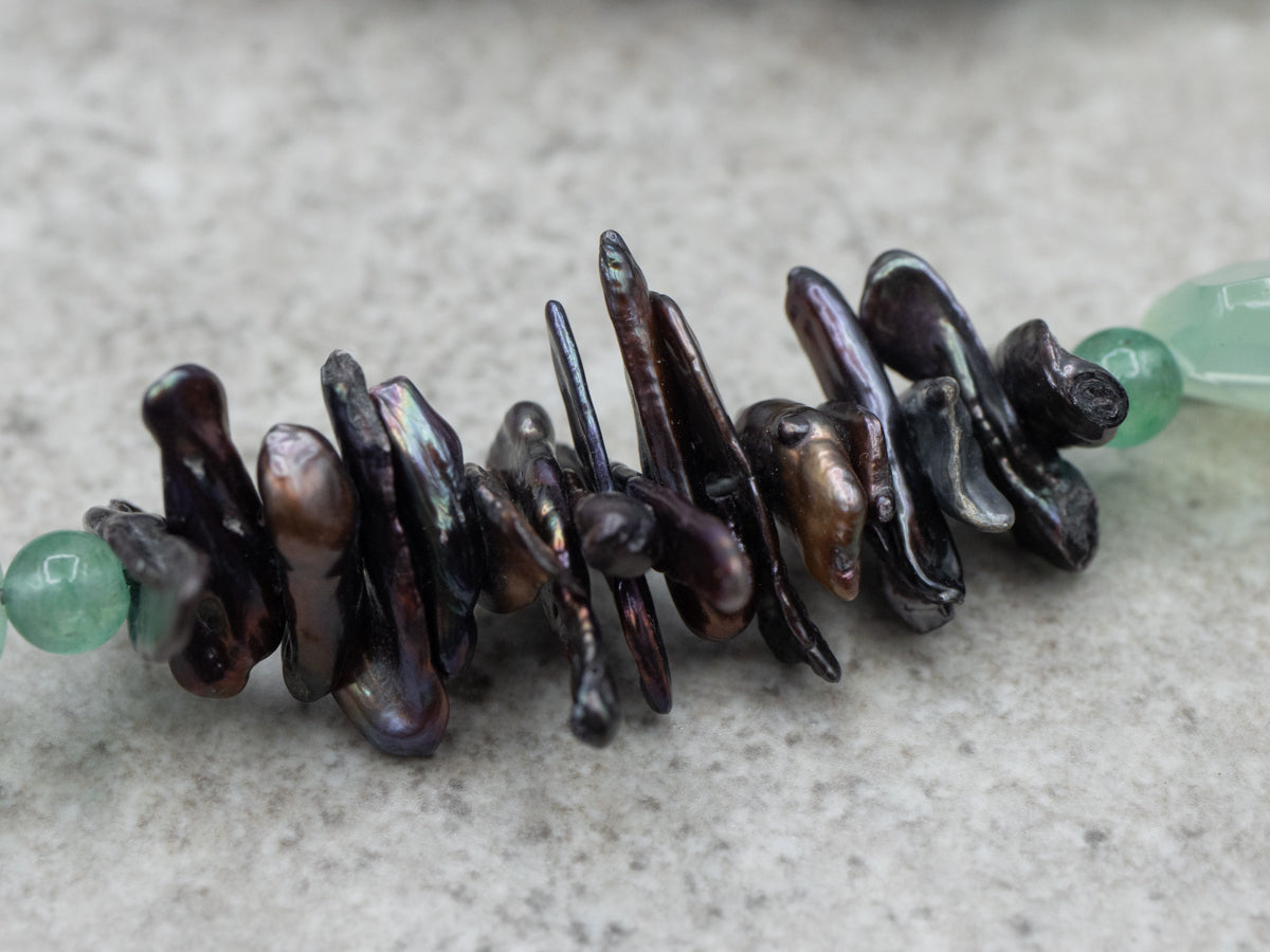 Indulge in the opulence of our exquisite beaded baroque pearls and aventurine necklace, adorned with stunning rice pearls in shimmering shades of plum and copper, embellished with lustrous seafome green aventurine beads. Luxuriously chunky, this bold and stylish piece exudes effortless elegance and charm.