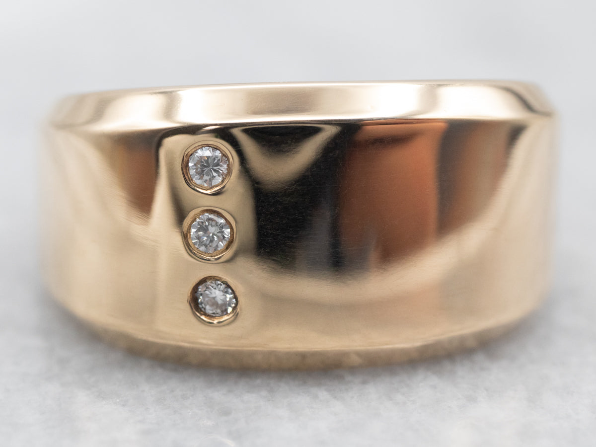 ¡Este anillo tiene una maravillosa forma geométrica, un perfil rectangular y una hilera diagonal de diamantes engastados en canales! Todos los diamantes son de talla brillante, profundamente engastados en un estilo de caja de sombra que le da al anillo un brillo único, lujoso sin ser ostentoso.