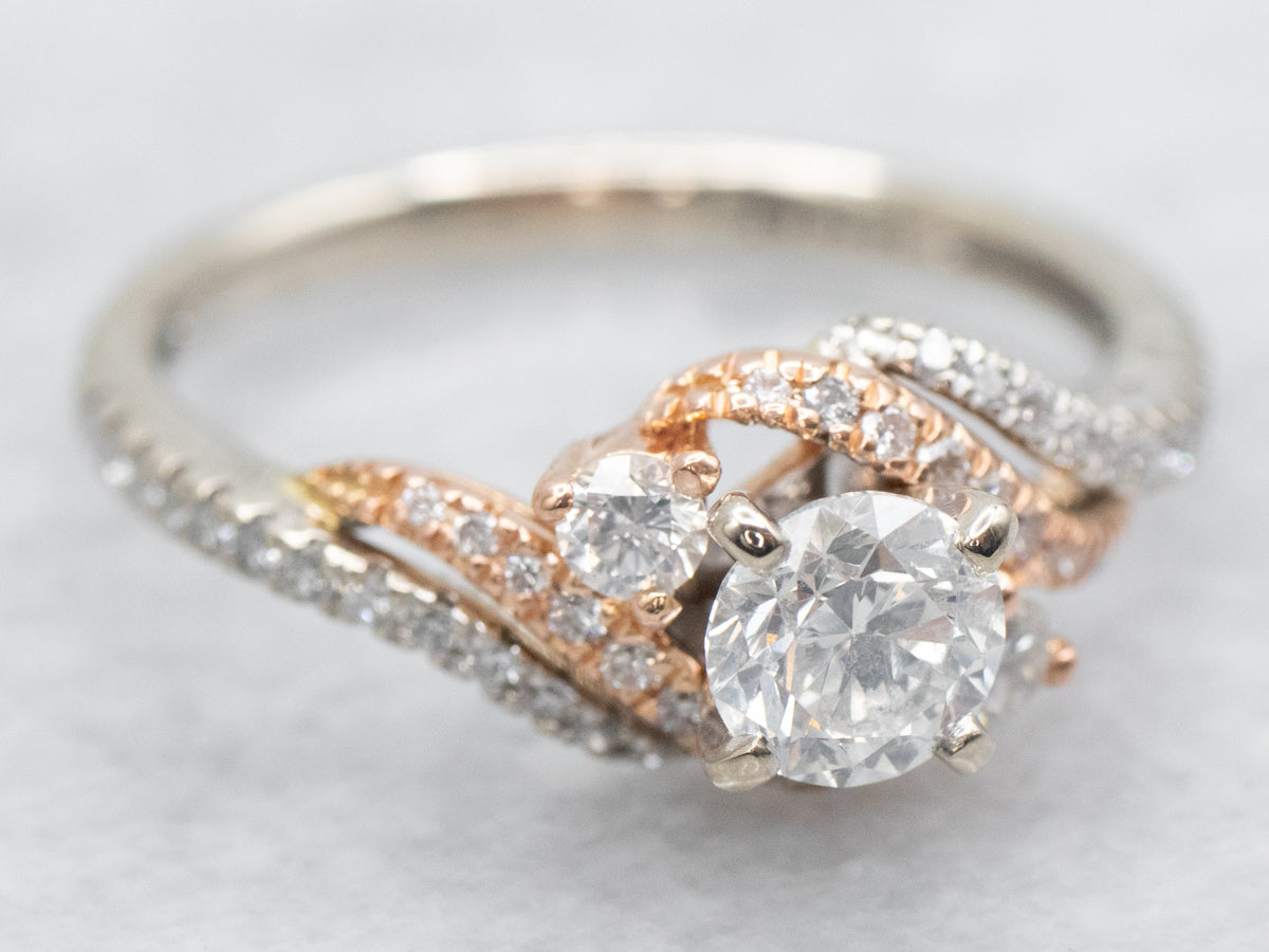 ¡Absolutamente querido, este anillo antiguo sería un hermoso anillo de compromiso alternativo, un anillo para la mano derecha o una pieza de aniversario! El anillo está hecho de forma sencilla, con oro rosa de 14 quilates formando los vástagos y cabezas florales de seis puntas que sujetan las piedras. ¡Este anillo también se conoce como anillo "toi-et-moi" (o tú y yo) y puede simbolizar a dos personas que se unen como una sola!