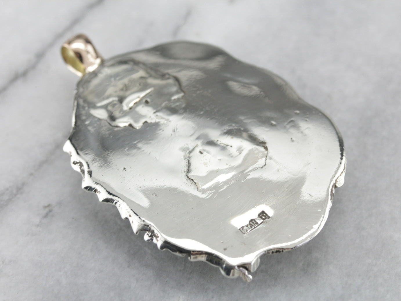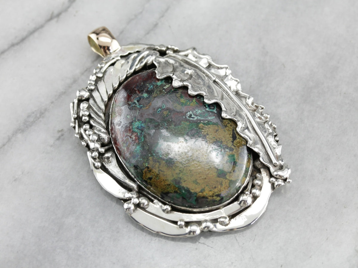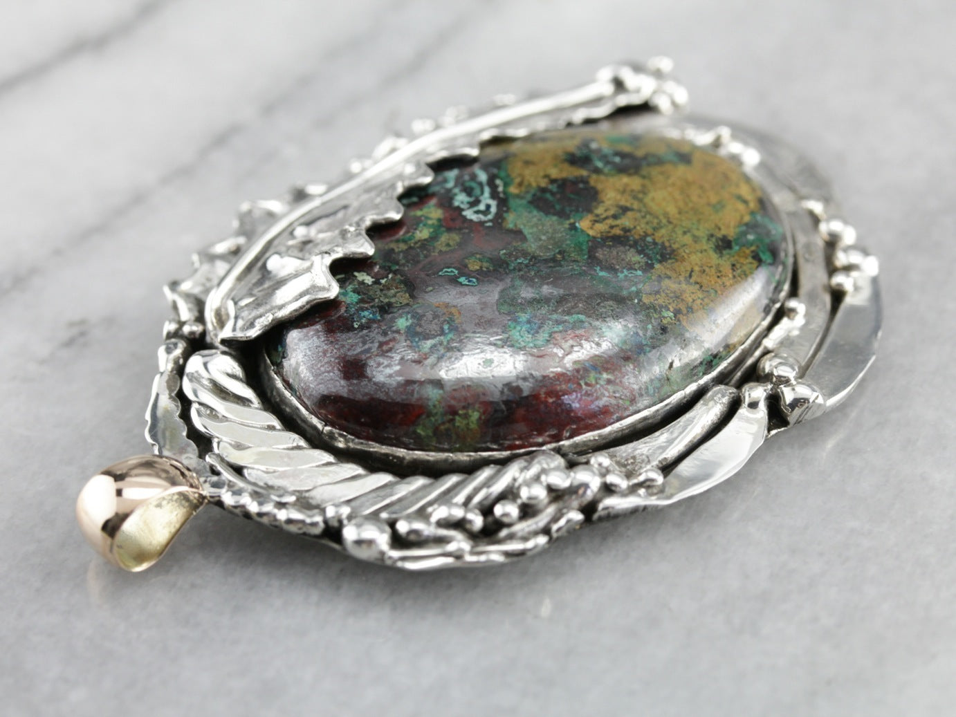 A chrysocolla cabochon in earthy tones of burgundy, teal and gold shades sits at the center of this gorgeous sterling silver pendant. The framework dates to the mid-1900's, but we've added a rose gold piece from the Victorian era to the silver, creating a unique bail that pulls the warm and cool colors together.